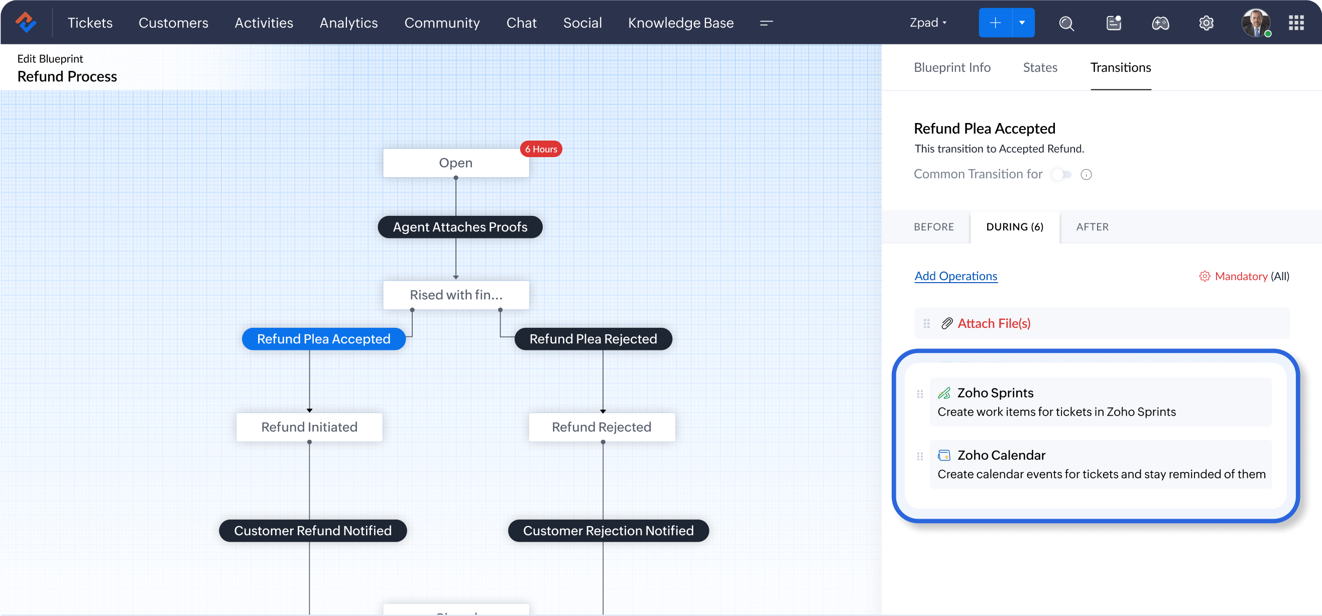 O blueprint no Zoho Desk ajuda sua equipe de suporte a se manter no caminho certo mesmo quando ninguém está monitorando ativamente. Você pode criar fluxos de blueprint para definir estágios e ações específicas que os tickets devem seguir à medida que avançam no processo de suporte. Por exemplo, quando você recebe uma solicitação de devolução, pode mandar o fluxo de trabalho para devoluções e reembolsos exigir que você anexe comprovantes e os envie para a equipe financeira antes de poder prosseguir.
