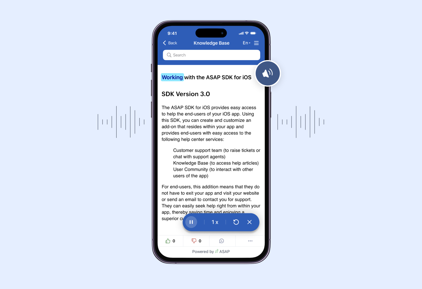 O TTS é acessível através do portal de autoatendimento (ASAP) do SDK móvel do Zoho Desk e foi implementado para aplicativos React Native e Flutter. Incorporar o TTS na sua base de conhecimento oferece flexibilidade aos usuários ao consumir conteúdo, oferecendo opções de controle de velocidade, pausa e parada. Com o TTS, nosso objetivo é aprimorar a acessibilidade e o suporte ao usuário, convertendo texto em áudio de forma transparente com um único clique.