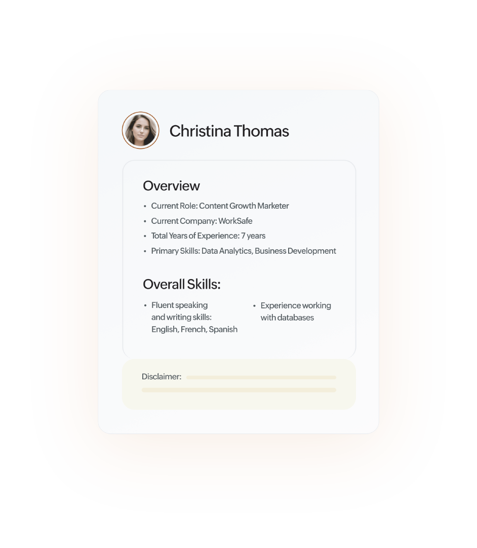 With the Profile Summary, we can generate a structured overview of each candidate’s profile with a single click. Key sections like Overview, Skills, Experience, Qualifications, and Accomplishments are displayed in either a bulleted or descriptive format, making it easy to visualize candidate skills at a glance.
