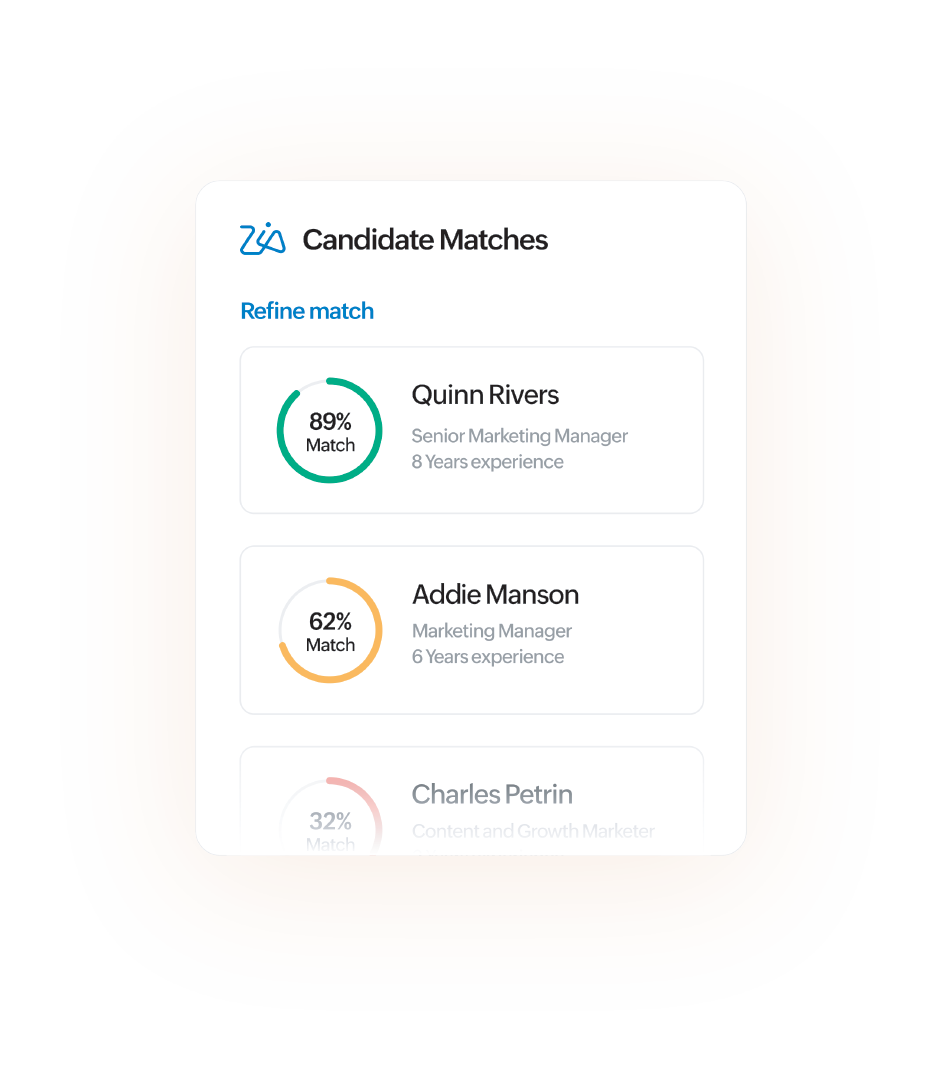 Zia’s Candidate Matches automatically shortlists candidates by aligning their skills and qualifications with job openings. We can also refine the match to focus on specific criteria like experience, skills, or location.