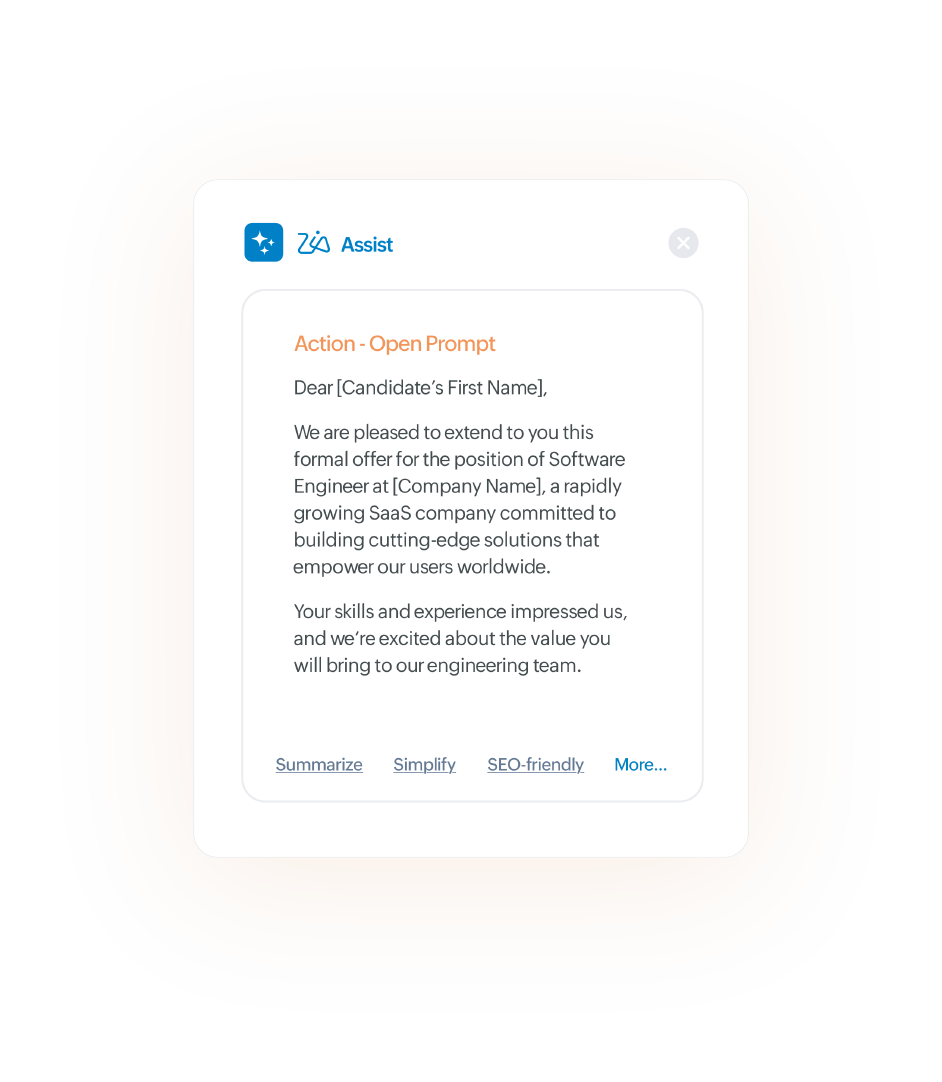 Zia is an intuitive, intelligent, built-in AI assistant that makes hiring more human by letting us focus on what matters most: finding the right people.