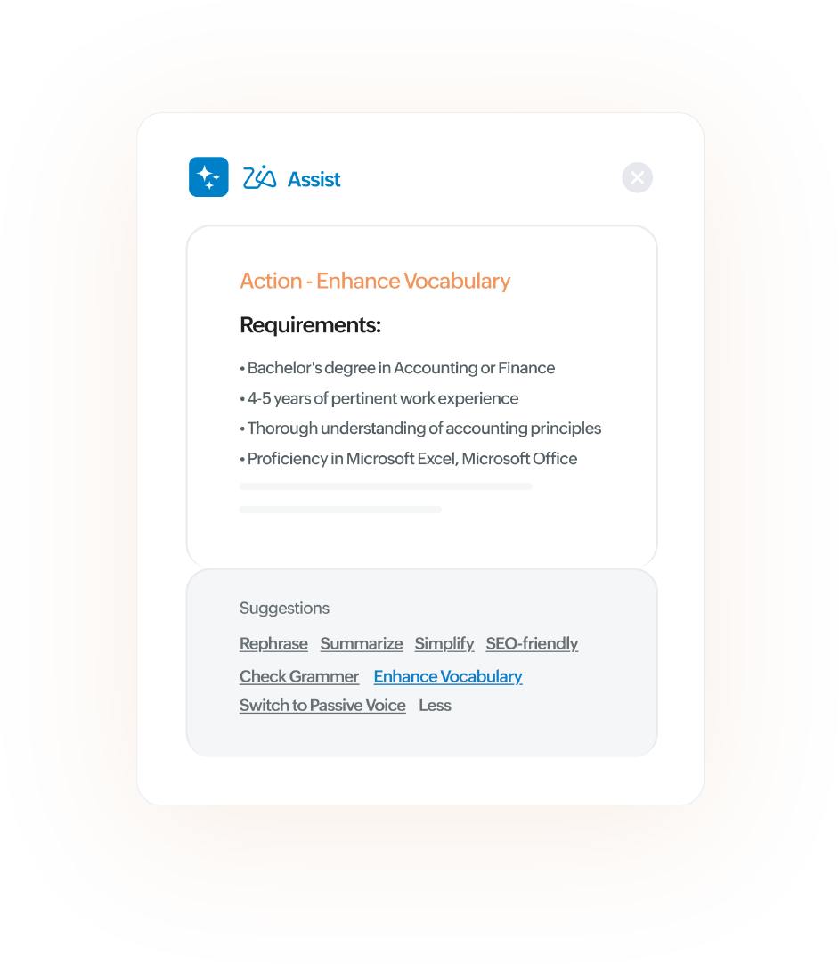 Now, we simply feed in the job role, requirements, and our company’s tone. With a single click, Zia AI assist generates post-ready job descriptions that align with the role, reflect our brand voice, and appeal to a wider audience.