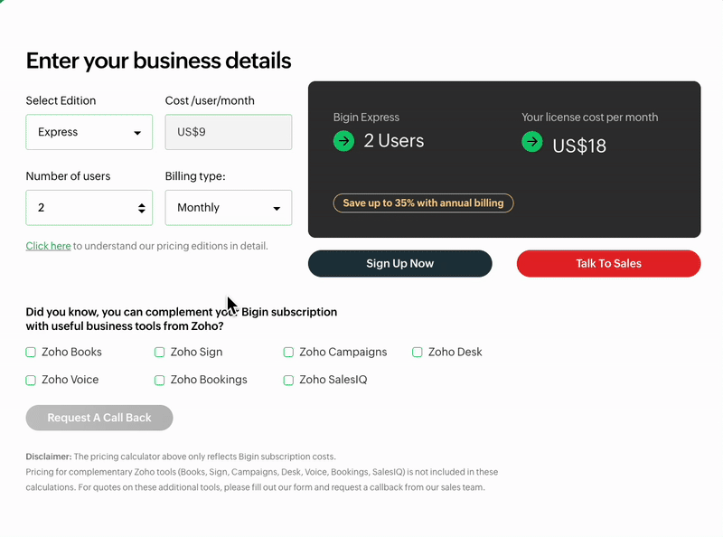 팀 규모를 입력하고 요금제를 선택한 뒤, 월간 결제인지 연간 결제인지만 결정하면 됩니다. 그러면 Bigin을 실제로 사용하기 위해 지불해야 할 금액이 즉시 표시됩니다.복잡한 계산이나 숨겨진 비용 없이, 불필요한 요소를 모두 제거한 간단한 방식입니다.