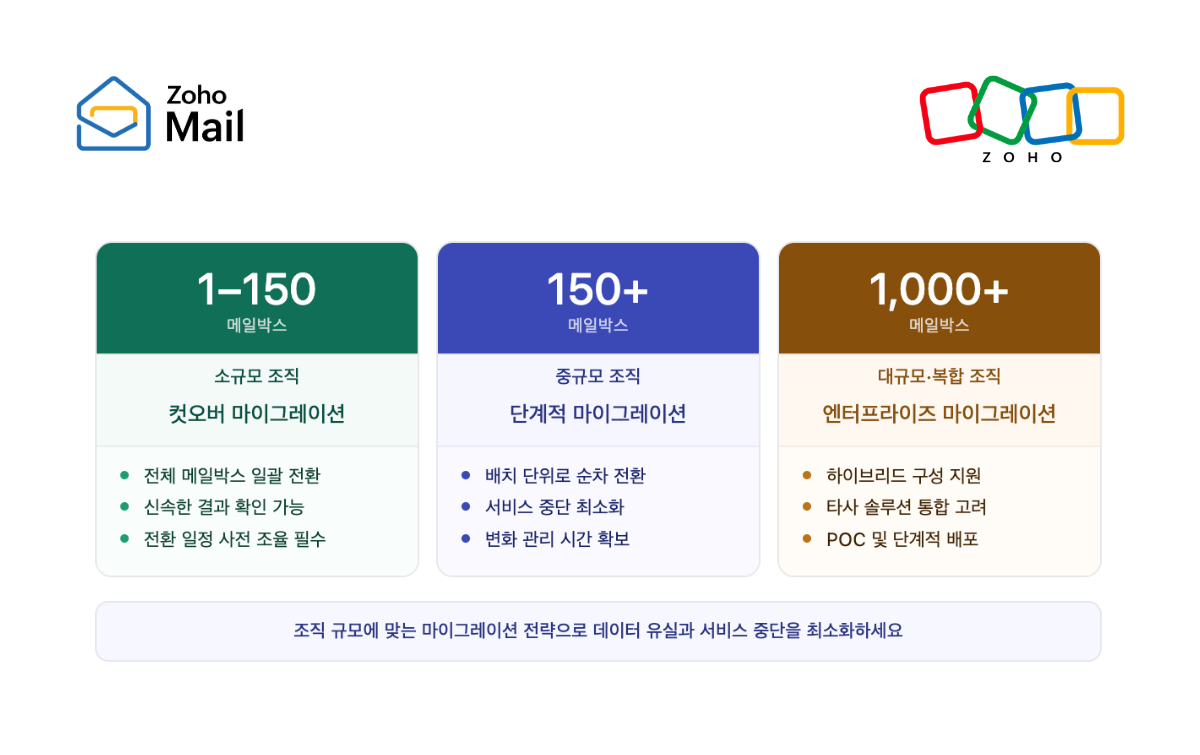 컷오버 마이그레이션은 메일박스 수가 150개 미만인 소규모 조직에 가장 적합한 방식입니다. 모든 메일박스를 조호 워크플레이스(Zoho Workplace)로 한 번에 이전할 수 있어 전환 결과를 신속하게 확인할 수 있다는 장점이 있습니다. 업무 중단을 최소화하기 위해서는 전환 일정과 적용 시점을 사전에 면밀히 조율하는 것이 중요합니다.