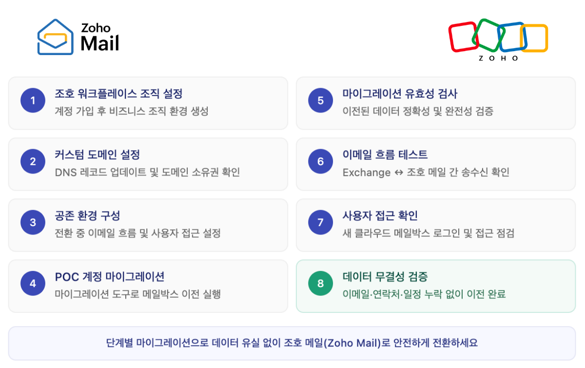 조호 메일(Zoho Mail)로의 마이그레이션은 아래 8단계를 따라 진행합니다. 조직의 세부 요구 사항에 따라 일부 단계는 조정될 수 있습니다.