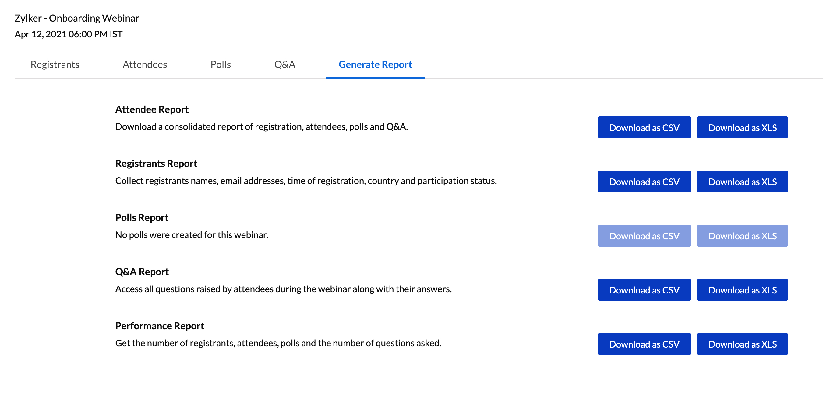 Analyze the efficacy of your online presence with customizable performance metrics. Document your webinar registrant information, poll results, and Q&A engagement based on your organizational prospects. You can also export them as CSV or XLS reports.