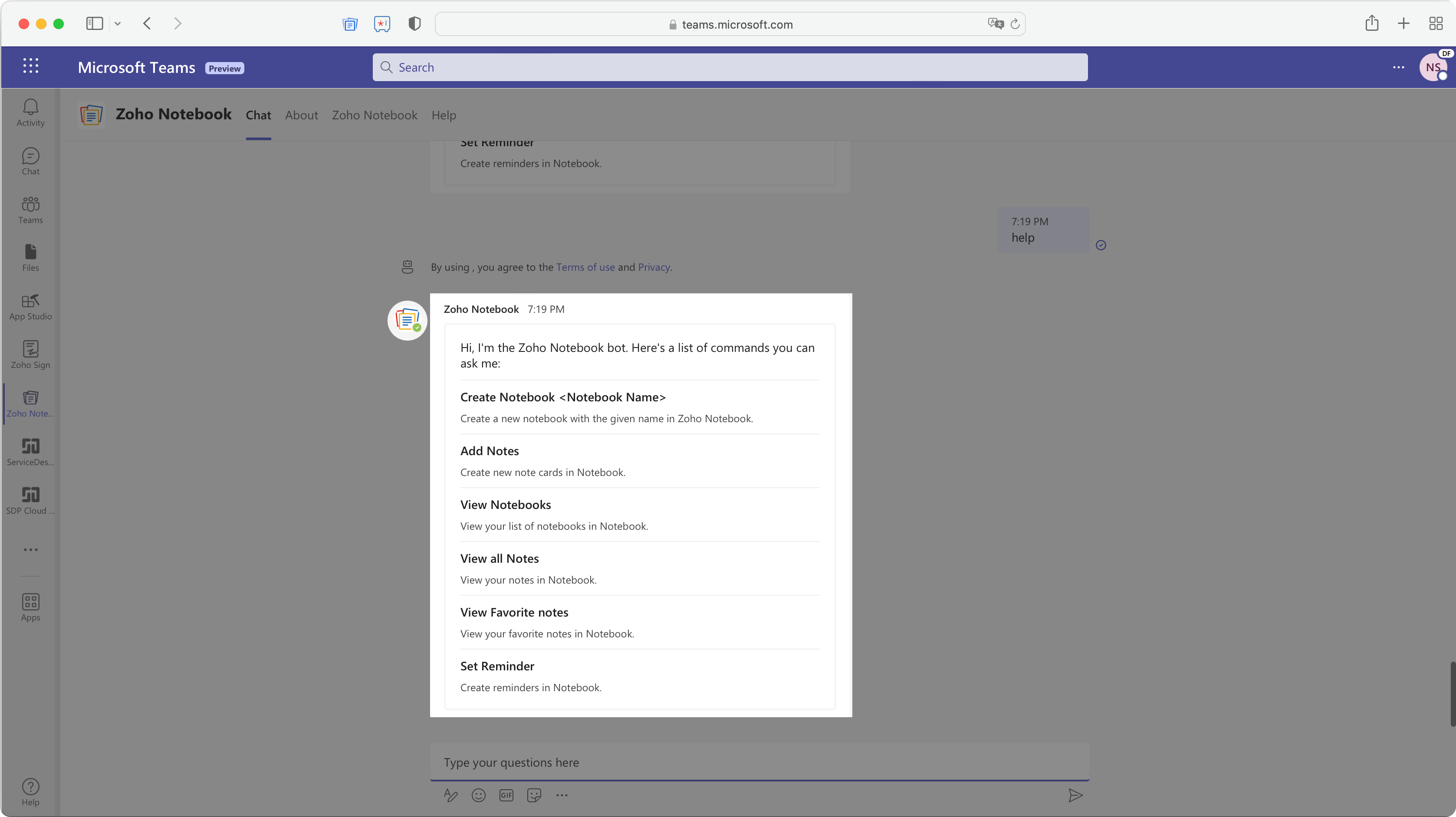 Save time and be more focused on your work with the Zoho Notebook bot in Microsoft Teams. With the Notebook bot, you can: