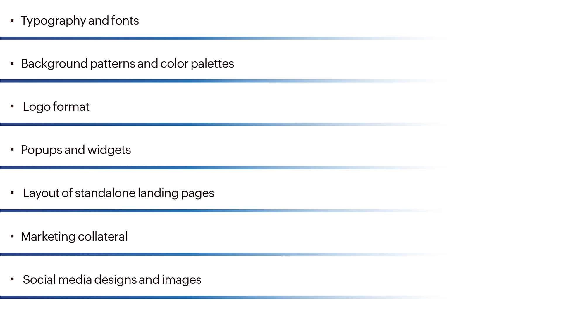 Looking for consistency in design elements in a website. Design elements like typography, color palette, logos, layout of the page, marketing colateral, sociual media images.