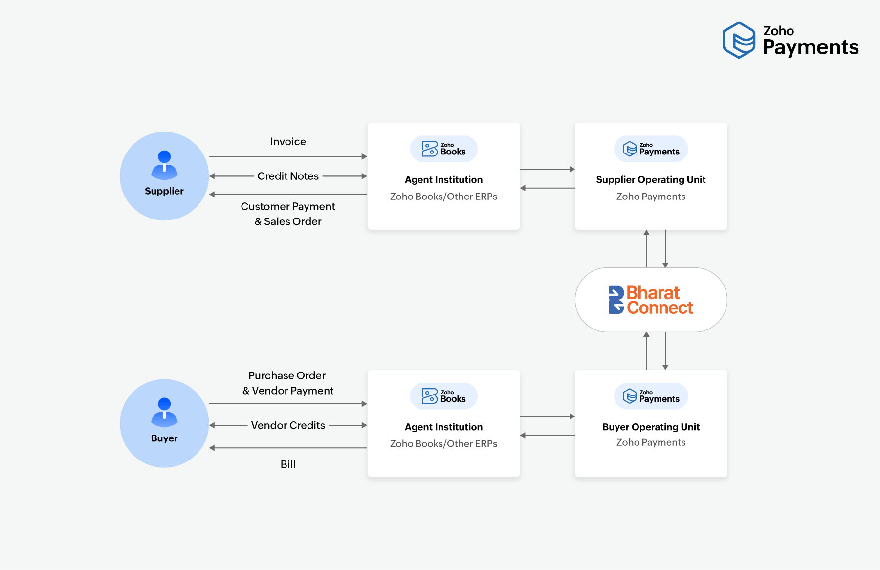 A buyer sends a purchase order through Zoho Books, which connects to Zoho Payments to connect them with sellers. The supplier receives it in his ERP, converts it into an invoice, and sends it back. If adjustments are needed, credit and debit notes are exchanged through the same system. Payments are initiated via Zoho Payments, and Bharat Connect ensures settlements reach the right party.