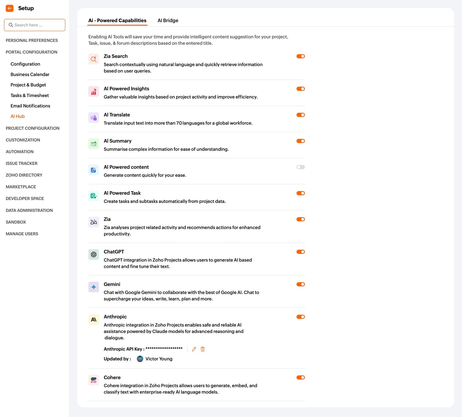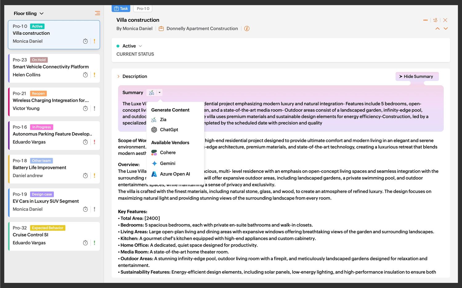 Let's say your team hired a replacement for a senior developer, and you need them to hit the ground running. Instead of spending hours going over lengthy descriptions and linked comment threads, simply generate a concise task summary with Zia (or other AI models) and catch them up to speed.