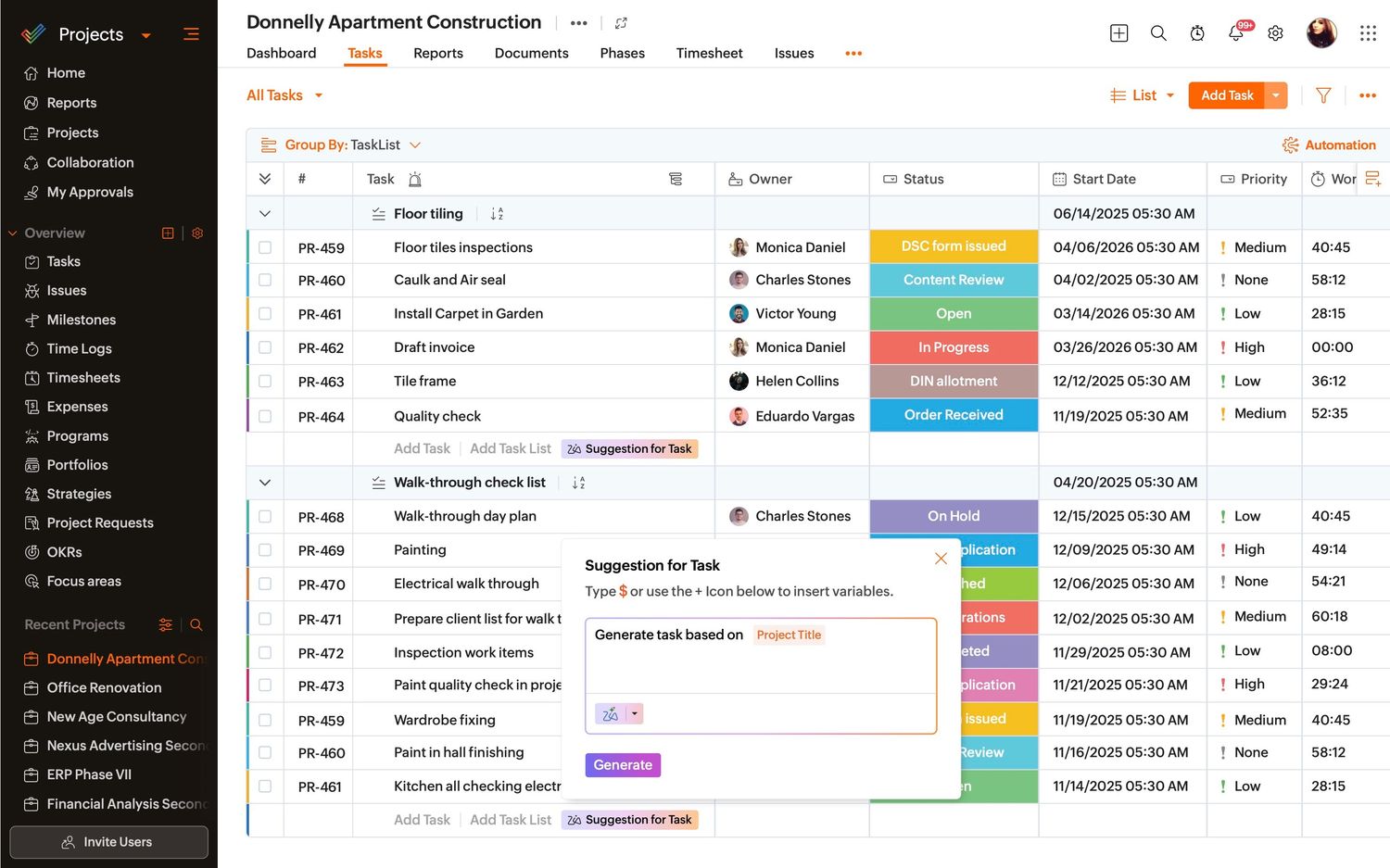 Creating tasks from scratch can sometimes be a hassle. AI helps by suggesting tasks based on your project title, description, and more. Pick the tasks you want, tweak them as needed, and put that extra time you saved to lucrative use.