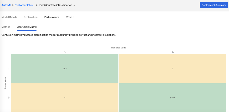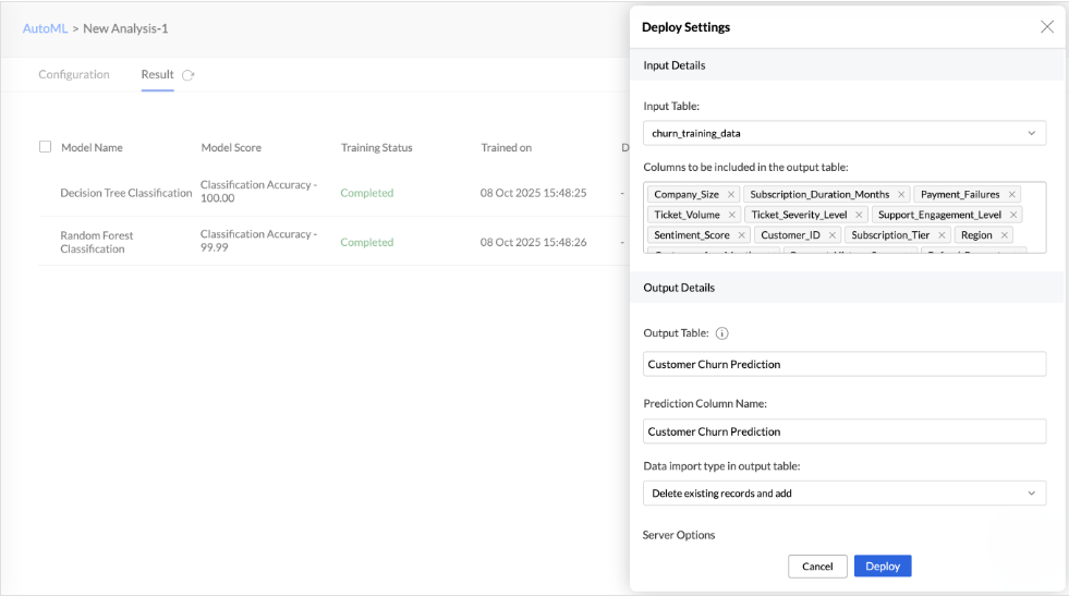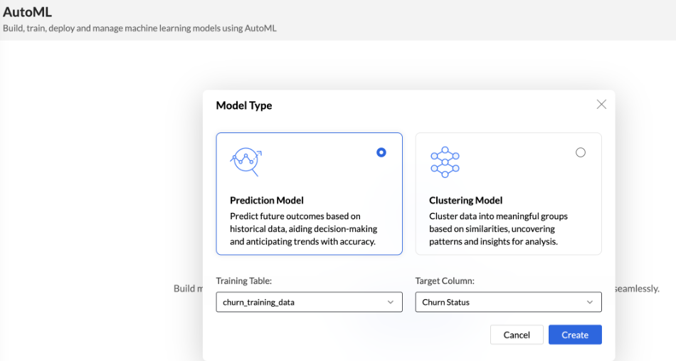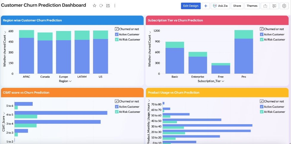 Com o recurso AutoML do Zoho Analytics, você pode criar um modelo robusto de machine learning que analisa dados históricos de clientes, detecta padrões de cancelamento e prevê com precisão quais clientes estão em risco.