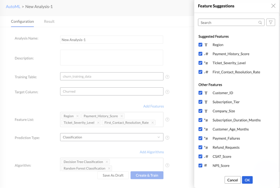 O mecanismo AutoML do Zoho Analytics recomenda com precisão os recursos e algoritmos necessários para o treinamento dos dados com base na coluna de destino.