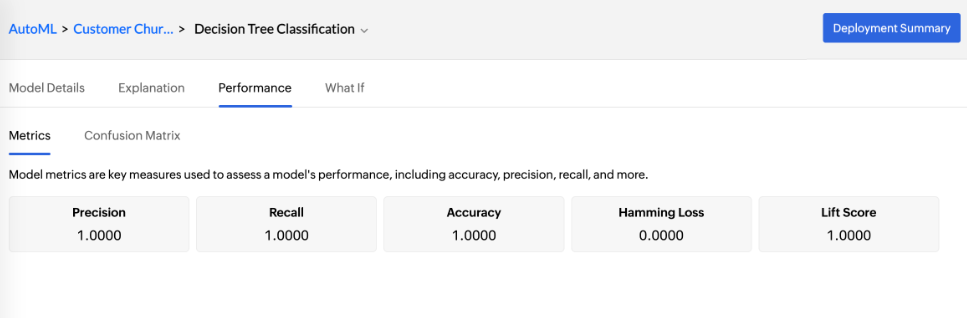 Após a conclusão do treinamento, a Pontuação do Modelo, juntamente com outras métricas essenciais, como Precisão, Revocação, Acurácia, Perda de Hamming e Lift Score, são fornecidas para avaliar o desempenho.