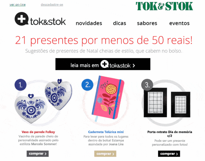 O primeiro exemplo que trazemos é da Tok&Stok, conhecida rede de lojas de móveis e decoração. Nesta campanha, eles apostaram no formato de listas com dicas de presentes por uma faixa específica de preço.
