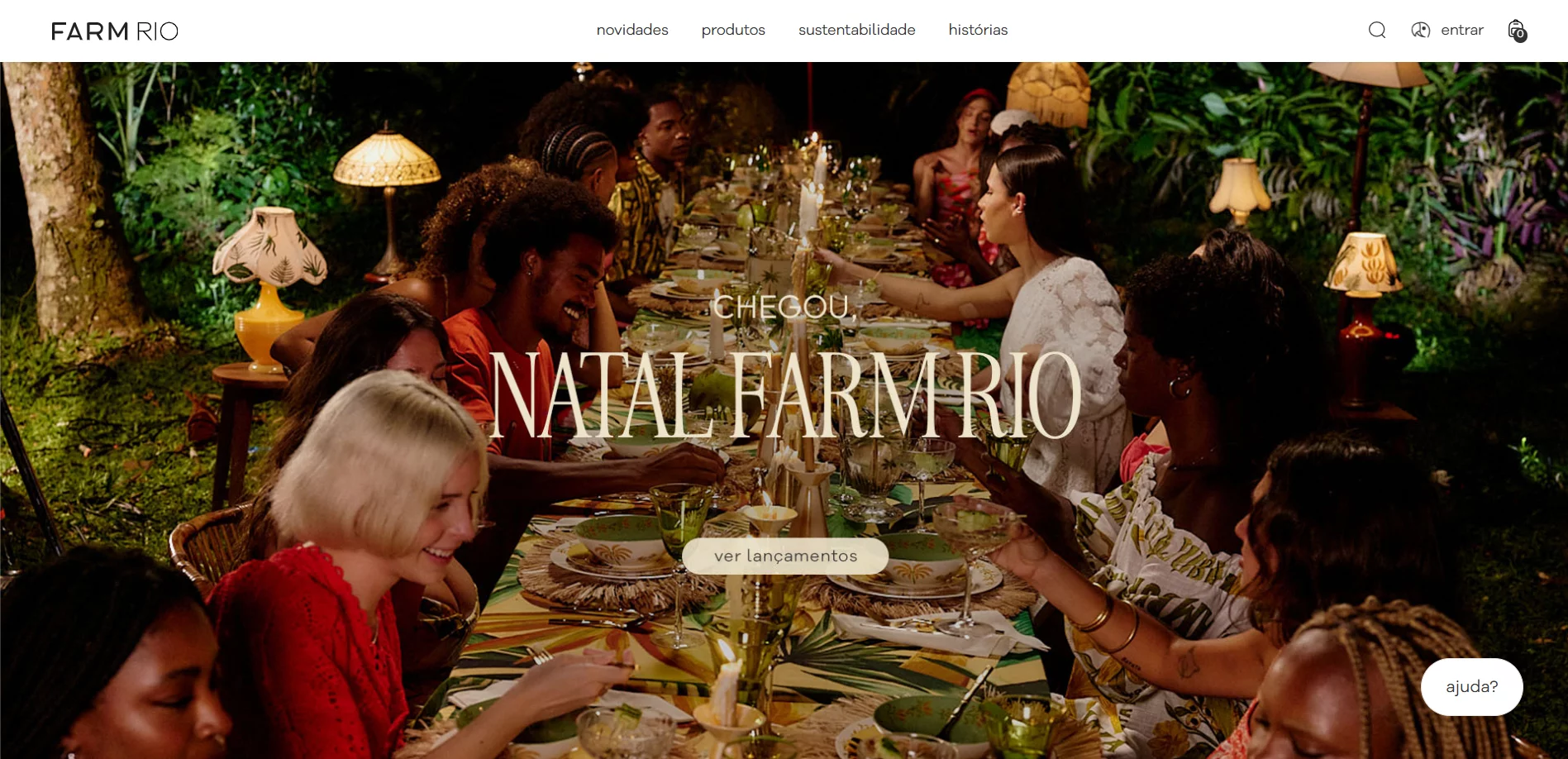 Por fim, trazemos este exemplo da marca de vestuário Farm. Numa abordagem mais simples e acessível, eles transformaram a home da loja virtual para destacar as novidades e lançamentos de Natal.