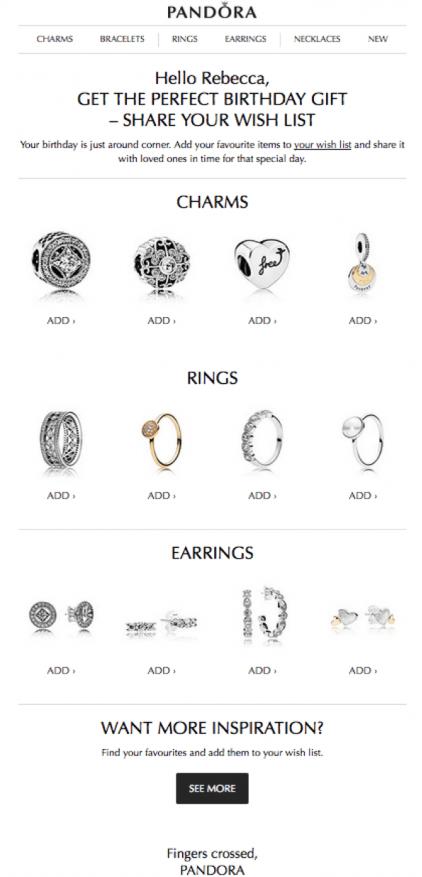 Neste segundo exemplo, a marca de joias Pandora adota outra abordagem: eles enviaram uma mensagem antes do aniversário da cliente, buscando não só demonstrar cuidado e atenção, mas também criar expectativa.