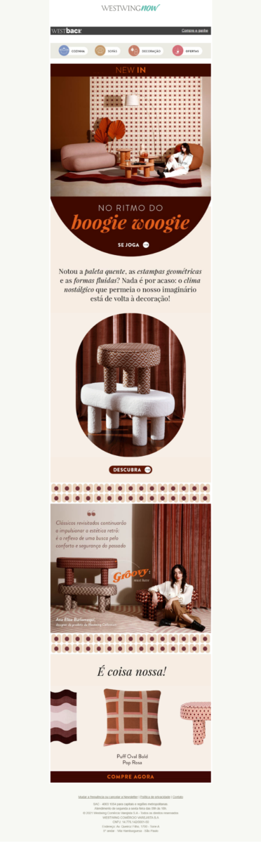 Como comentamos, a newsletter corporativa também pode ser usada para comunicar novidades aos clientes. É o que fez a Westwing, enviando uma mensagem com uma nova coleção.