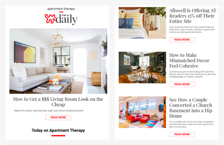 O envio de conteúdos relevantes também é uma estratégia que pode ser adotada em uma newsletter corporativa. No exemplo abaixo, a empresa fornece uma coletânea de diferentes textos, cada um com um título, um texto de apoio e uma foto de alta qualidade.