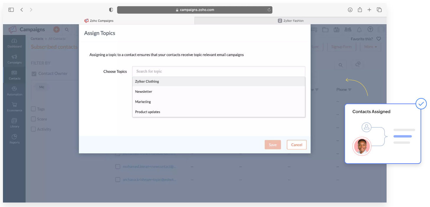 Com o Zoho Campaigns, é possível organizar toda a sua base de contatos com segmentações dinâmicas com base no perfil dos usuários e interação com as campanhas de e-mail, auxiliando na personalização do conteúdo e o envio das newsletters para as pessoas realmente interessadas.