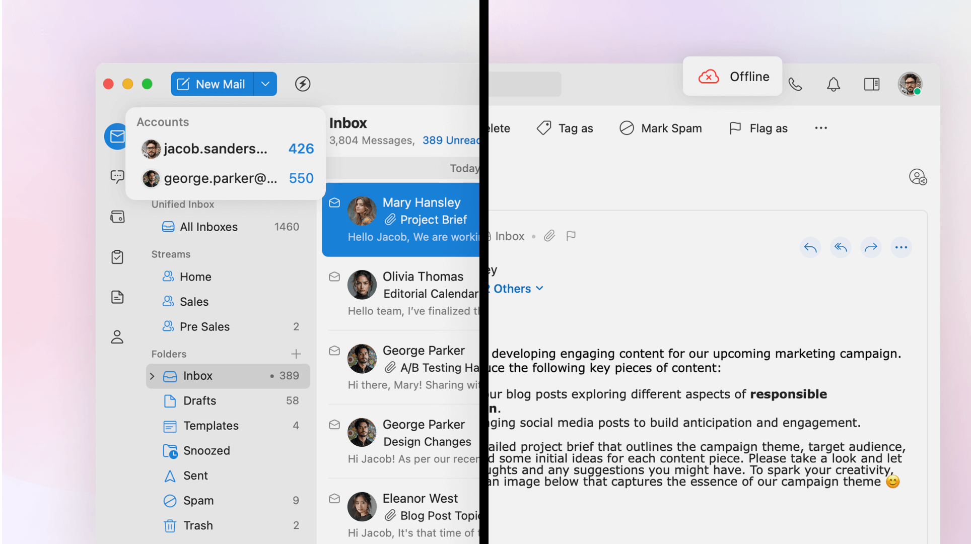 Quer você use um e-mail pessoal e profissional ou gerencie e-mails separados para cada equipe, a caixa de entrada unificada do Trident mantém tudo em um só lugar.
