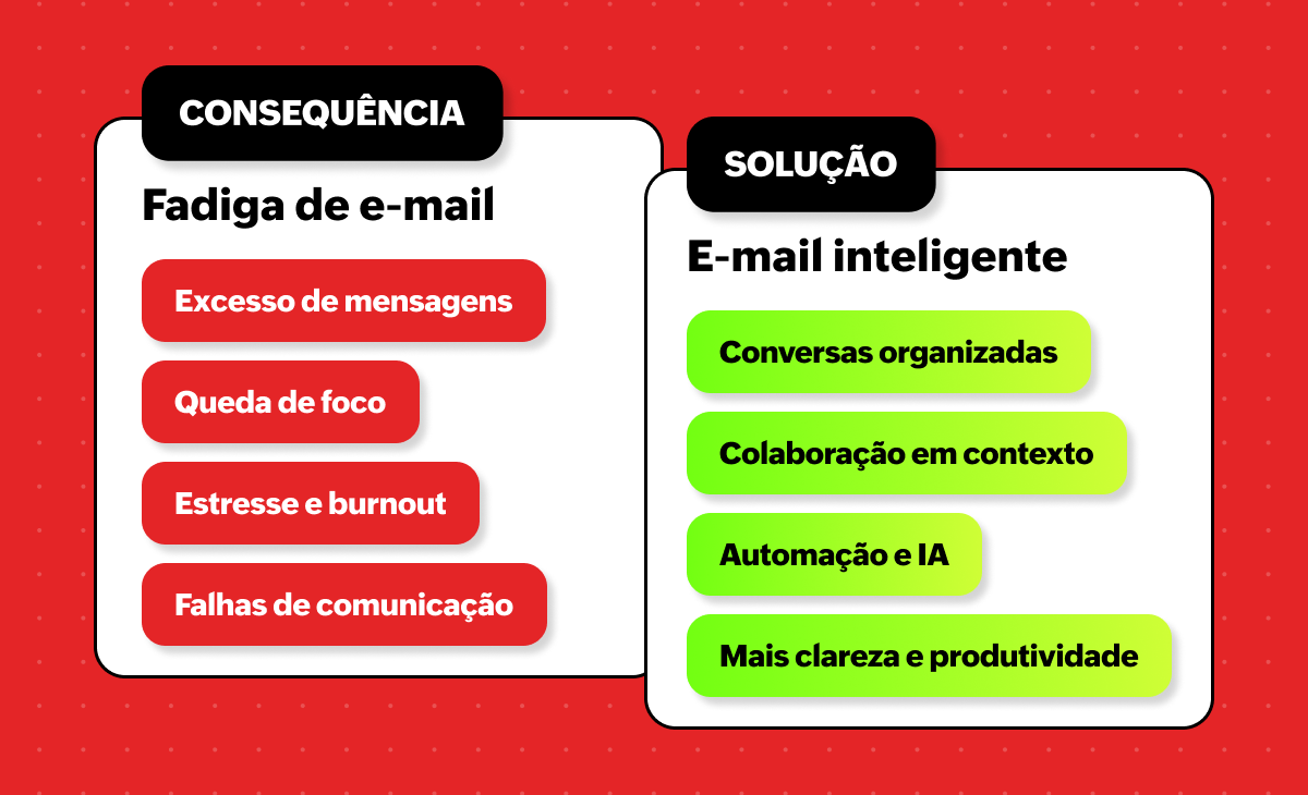 A fadiga causada pelo e-mail não respeita o tempo dedicado ao trabalho produtivo. Isso afeta a eficiência e aumenta a taxa de erros, além de prejudicar a sua saúde mental ao bagunçar os limites entre o trabalho e a vida pessoal.