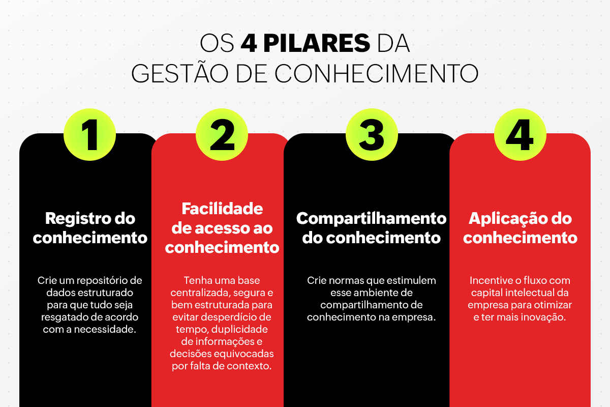 A implementação de uma estratégia eficiente depende de quatro pilares fundamentais. Cada um deles contribui para que o conhecimento corporativo seja gerado, mantido e aplicado.