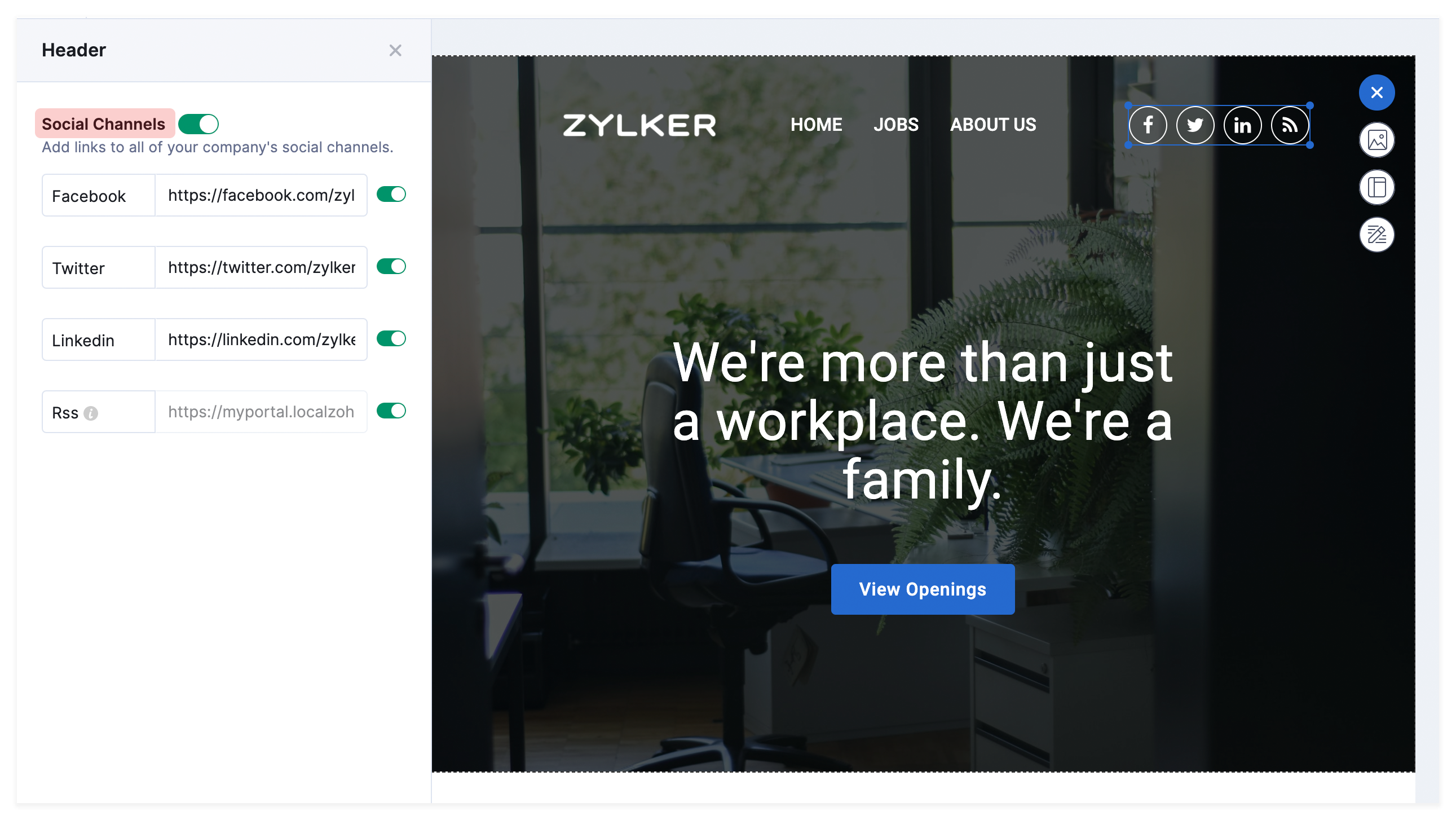 Letting your potential candidates follow you on social channels will help them stay in touch with your company updates and provoke genuine interest. When they follow your company profile and connect with hiring managers, it also creates a sense of trust. In fact, more than 50% of hires come through personal connections on LinkedIn. Zoho Recruit allows you to add your company’s Facebook, Twitter, and LinkedIn accounts to your career site interface. Plus, you can also share your jobs across to your community.