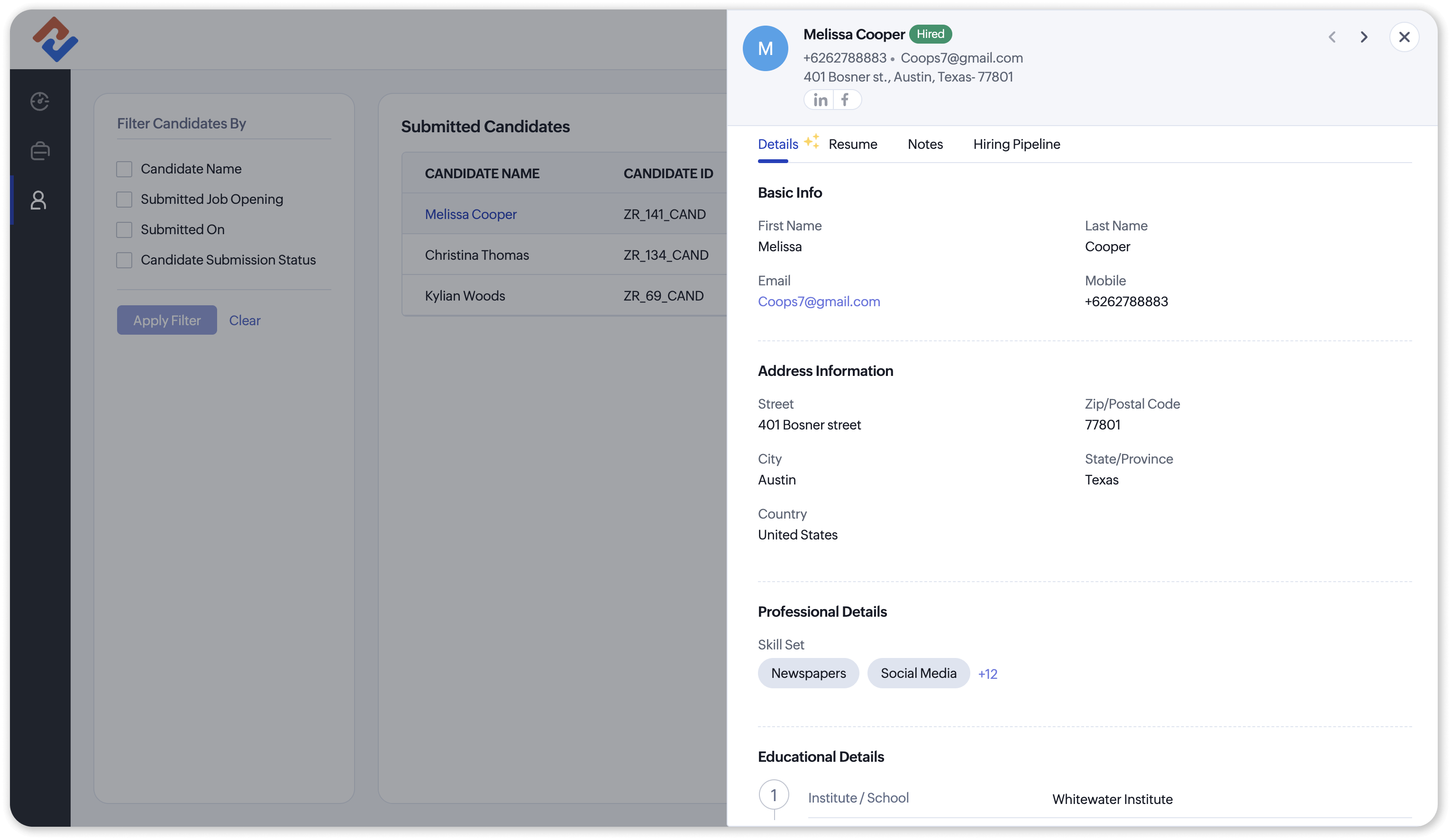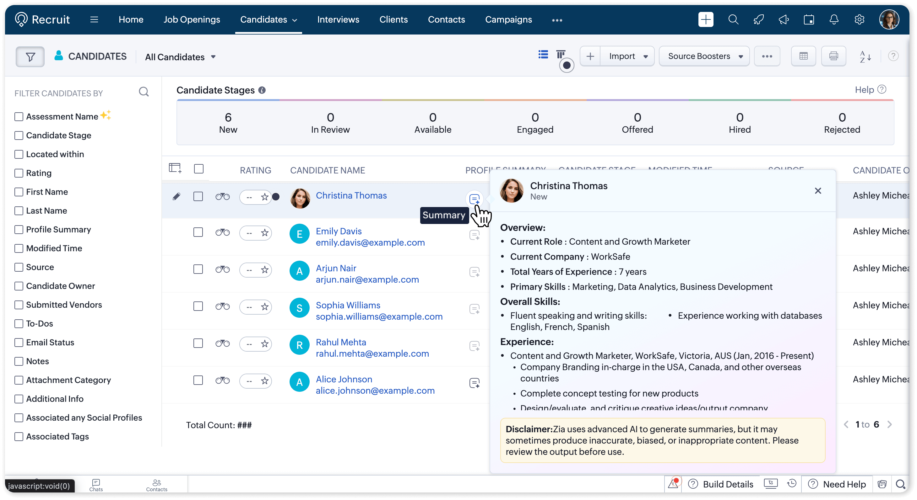 It's a super busy day. You open a resume among a hundred others. It’s five pages long, cluttered, and the formatting is messy. With the Profile Summary, powered by Zia, Zoho Recruit's AI Assistant, you can capture subtle insights and important details to present them in a clear, structured, and widely recognized format.