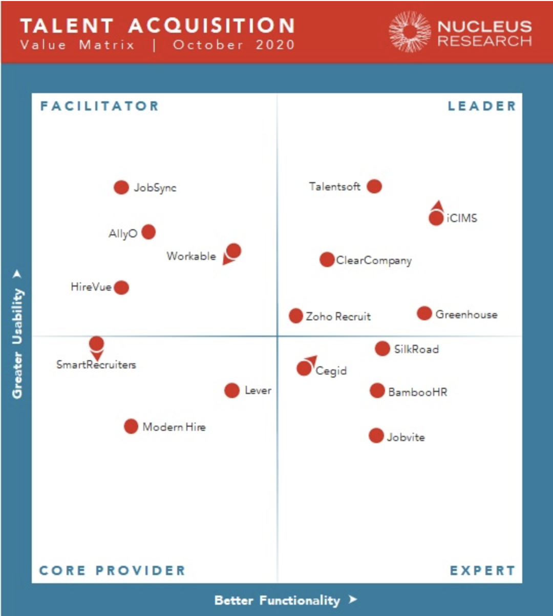 We’re excited to share that Zoho Recruit has been named a “leader” in this year’s Nucleus Research’s Talent Acquisition Technology Value Matrix, 2020. Nucleus evaluated talent acquisition vendors based on their usability, functionality and value to the users.