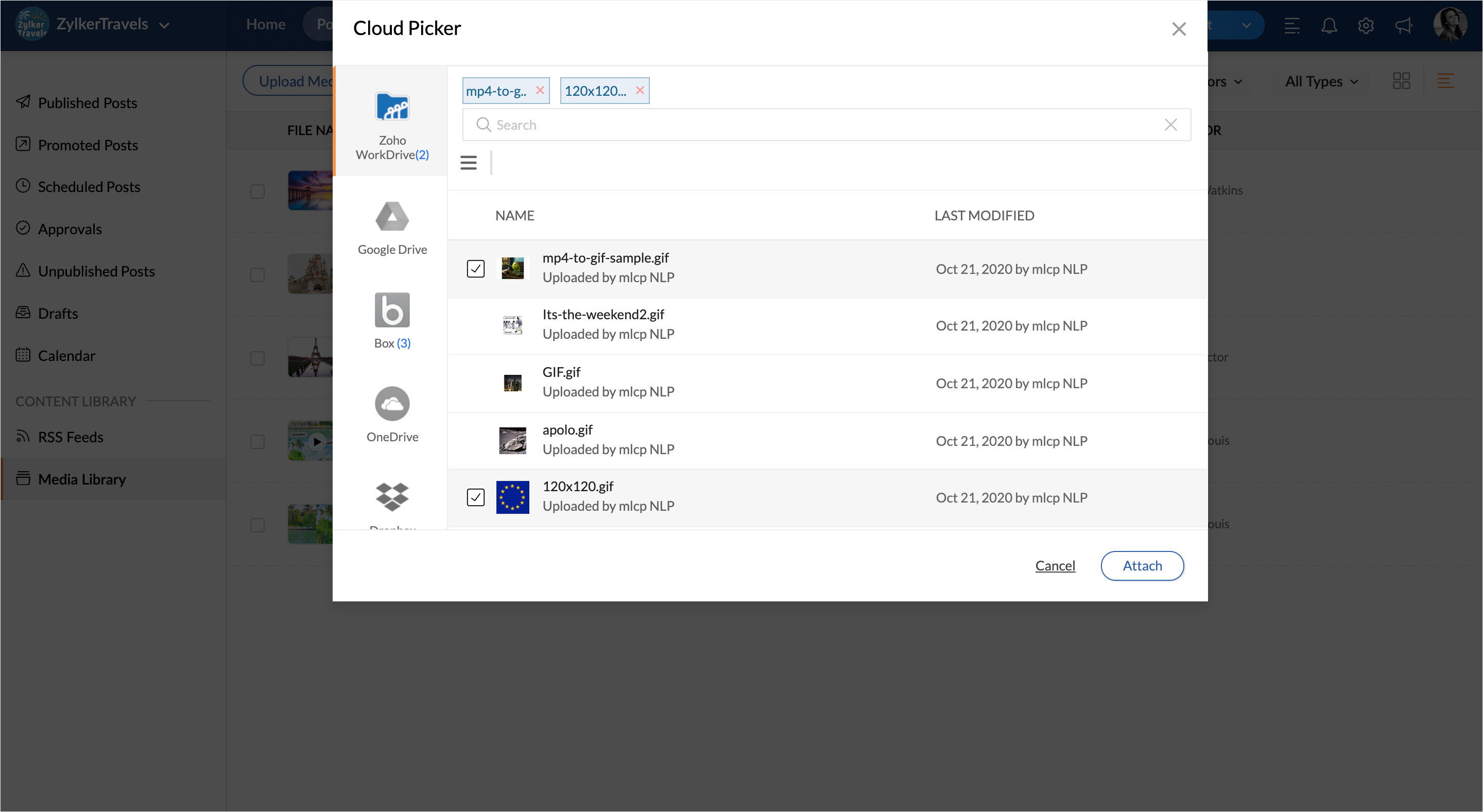 Access any of your media from across a range cloud platforms such as Zoho WorkDrive, Google Drive, DropBox etc, right from Zoho Social's publisher. With our new Cloud Picker tool, now access your resources from within Zoho Social by simply connecting your Brand to your cloud services.