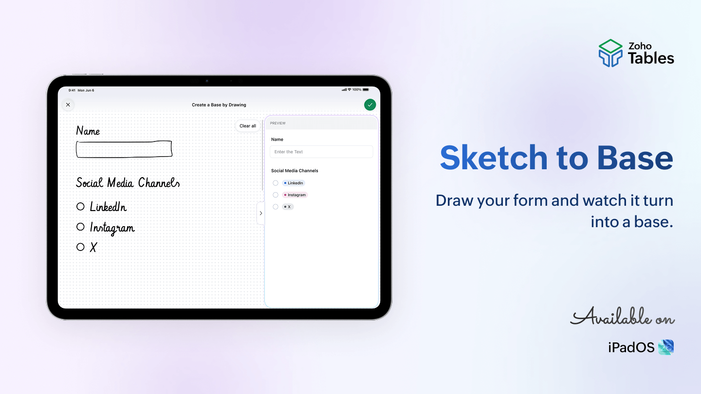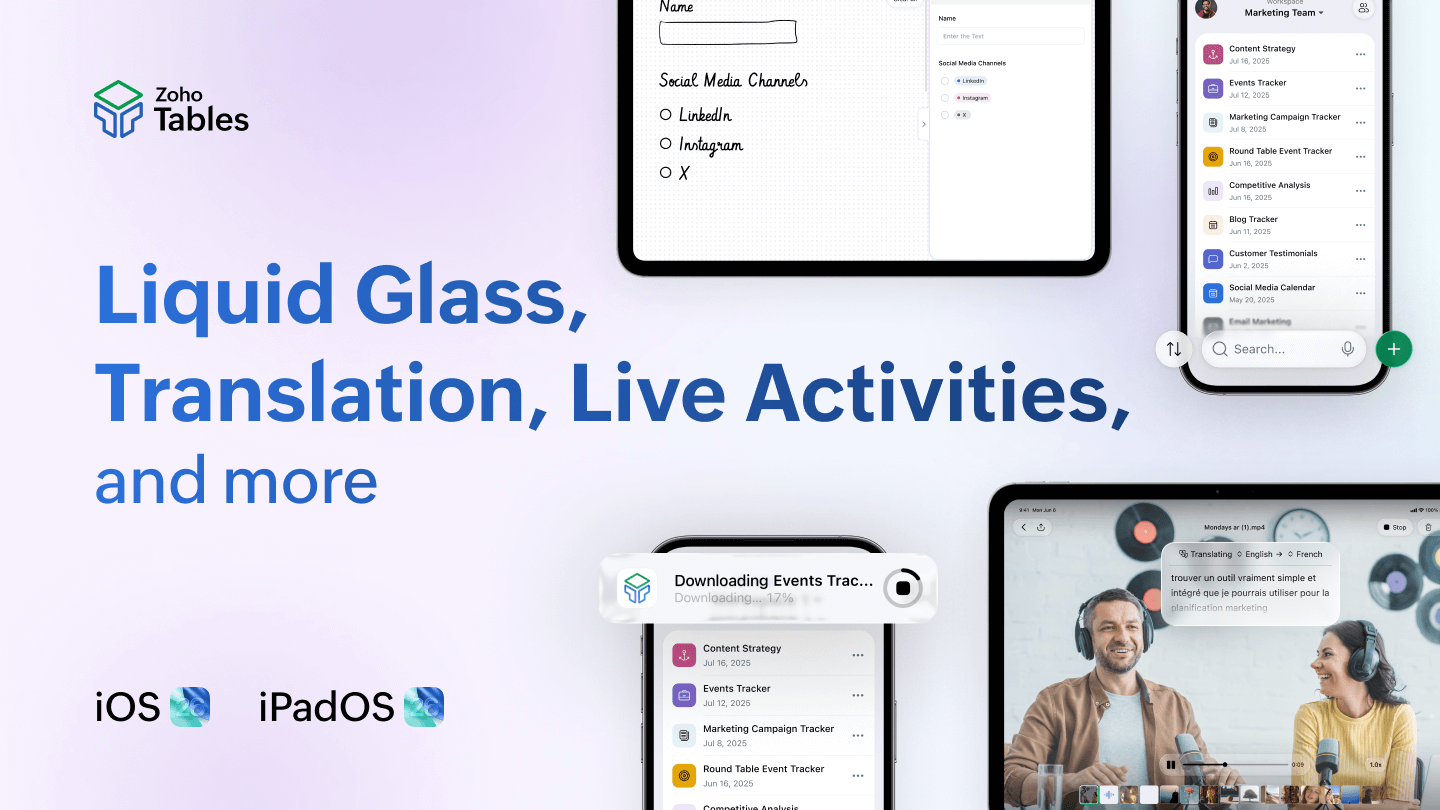 Built with Apple’s latest design language, Zoho Tables feels right at home across devices. With Apple Pencil magic, on-device AI intelligence, and a stunning new Liquid Glass design for fluid interactions, managing data feels more natural, visual, and effortless than ever. From sketching forms that build themselves to translating recordings with a tap, Zoho Tables is designed to turn data into action—instantly and intelligently.