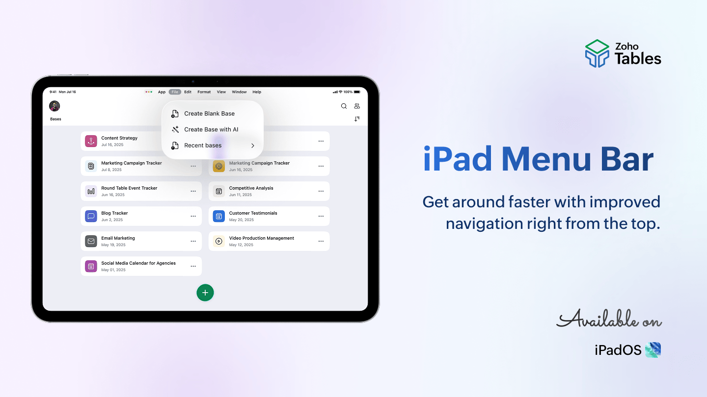 With the all-new iPad Menu Bar, you can navigate easily to look for your recent Bases, Create a Base from scratch with AI powered by Zoho's very own smart assistant, Zia, and more.