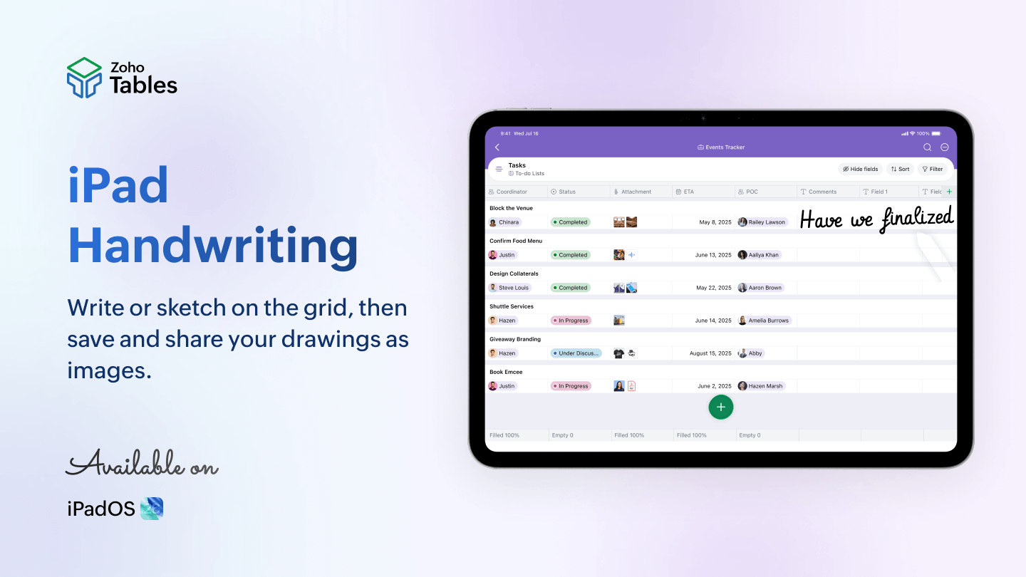 Your handwriting and sketches are now part of your data story. With deep Apple Pencil support, Zoho Tables transforms how you capture and organize ideas.