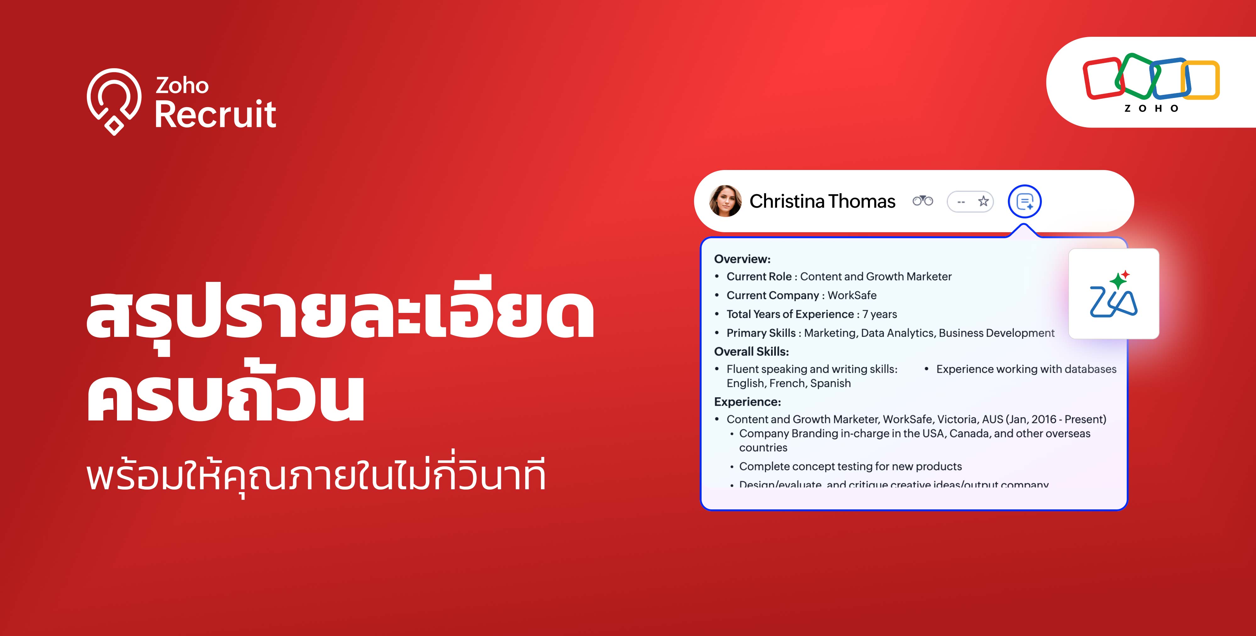 Profile Summary ขับเคลื่อนด้วย Zia ผู้ช่วยอัจฉริยะ (AI Assistant) ของ Zoho Recruit ที่สามารถดึง “สาระสำคัญ” จากเรซูเม่ได้อย่างแม่นยำ ไม่ว่าจะเป็น ทักษะ ประสบการณ์ คุณสมบัติ และผลงานสำคัญ แล้วแสดงออกมาในรูปแบบที่กระชับ อ่านง่าย และเป็นมาตรฐานเดียวกัน