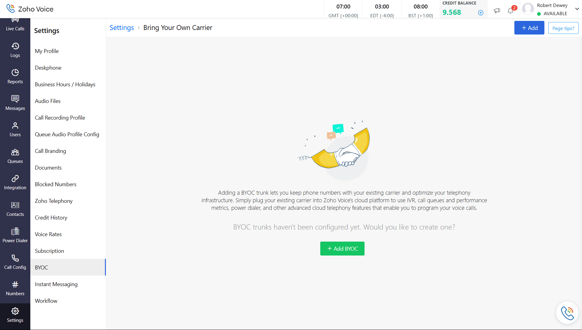 The newly launched BYOC can be configured in Zoho Voice under the Settings tab. You can add up to a maximum of 5 carrier configurations per organization.