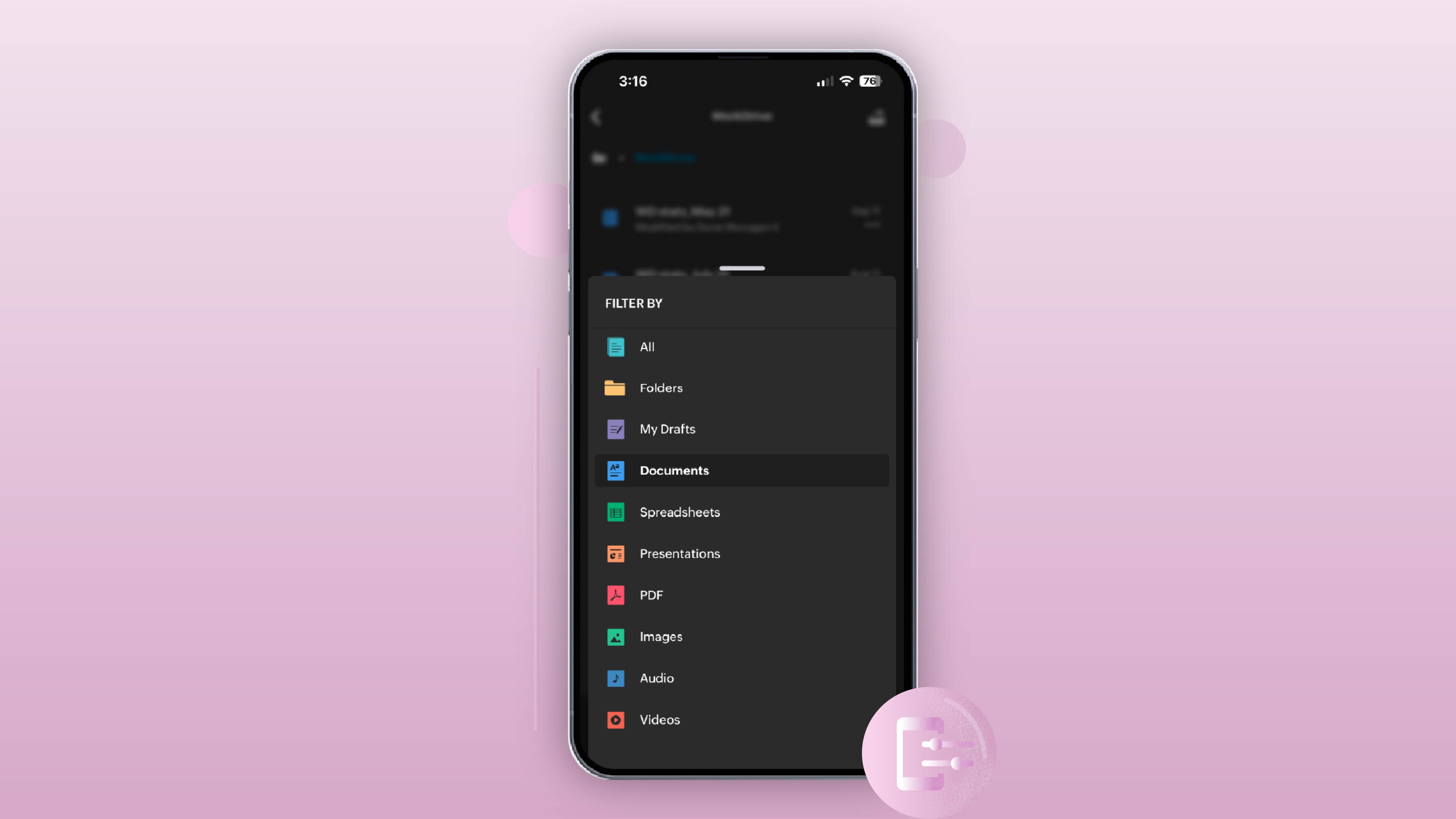 Multiple filter options have been added in the mobile app for quicker discovery of files and folders. We've also improved the data discovery experience by introducing search options at both the parent folder and the subfolder levels.