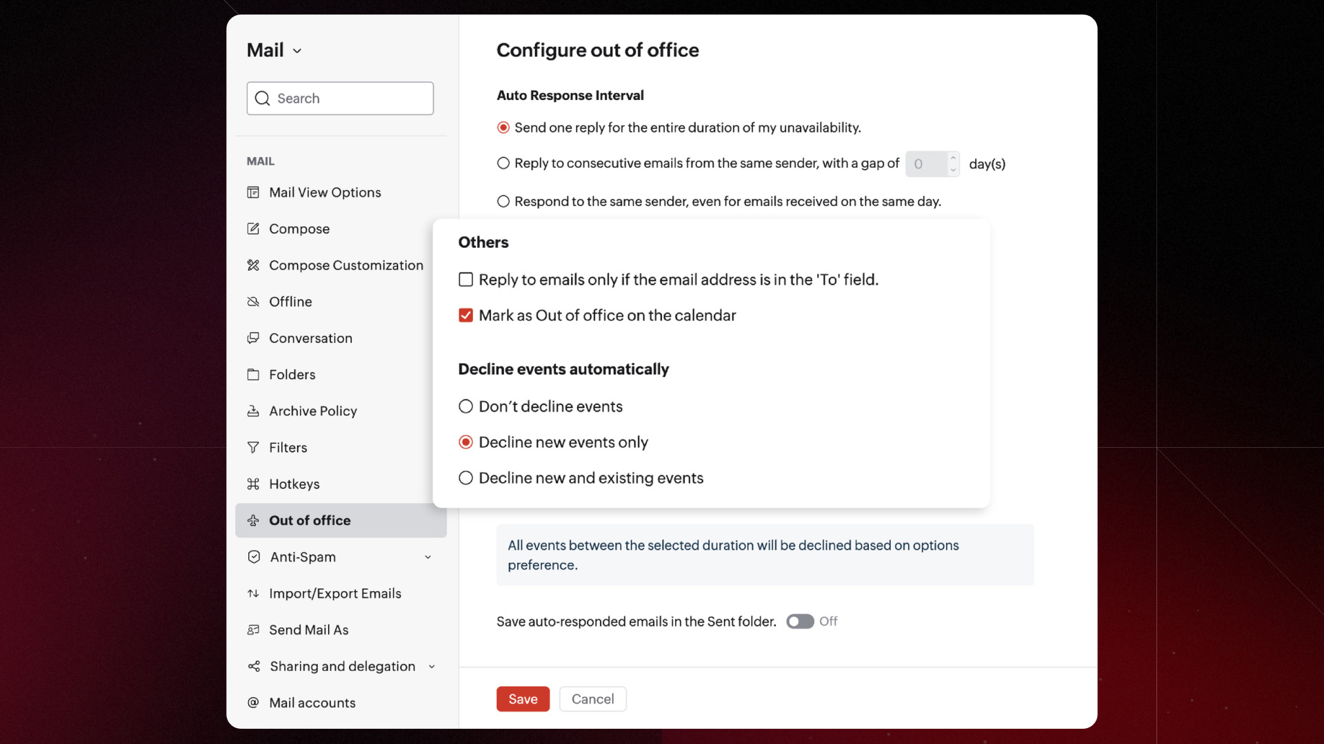 In Zoho Workplace, when you set up your out of office response in Zoho Mail, your calendar is automatically blocked for new events for your OOO dates. Any meeting invites that try to sneak in while you're away are automatically declined.