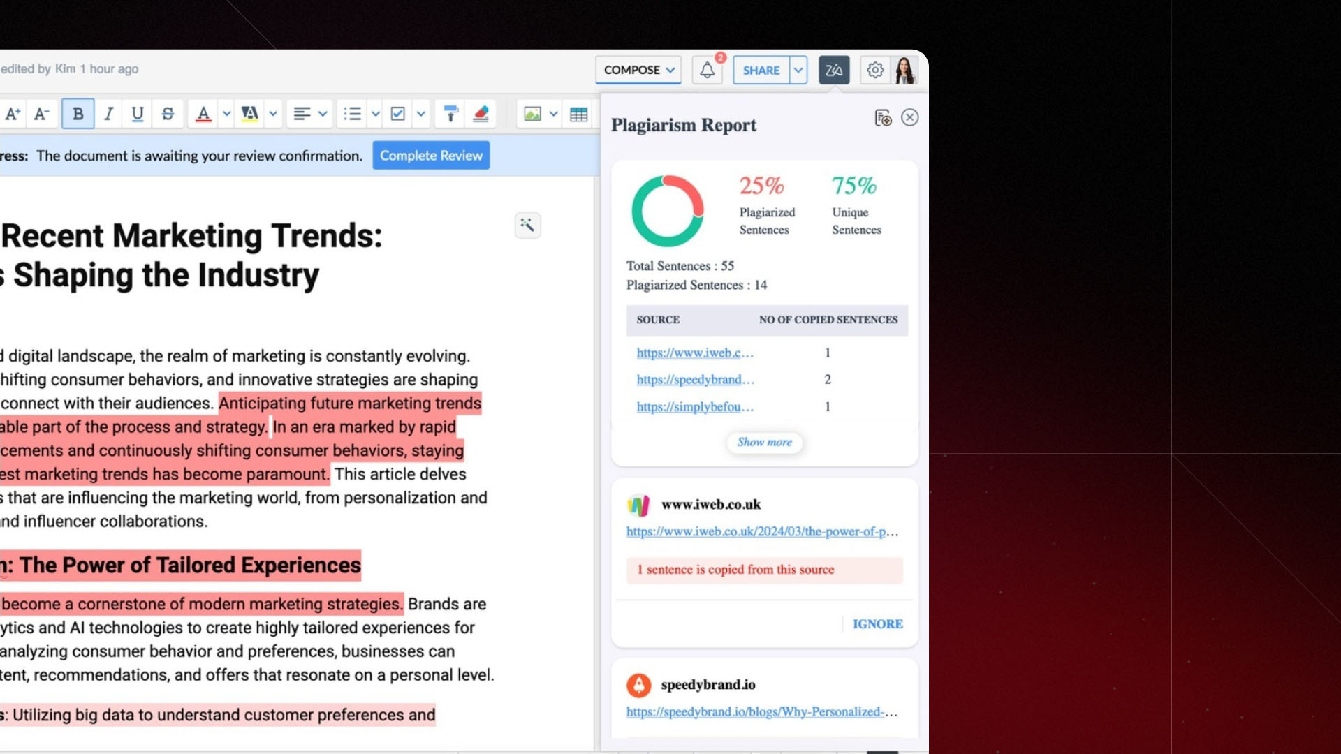 Zoho Writer’s built-in Plagiarism Checker acts as your final, eagle-eyed editor before you go live. It scans the web to see if your phrasing is a little too close to an existing source and nudges you to add the proper citation or tweak your working in case of an overlap.