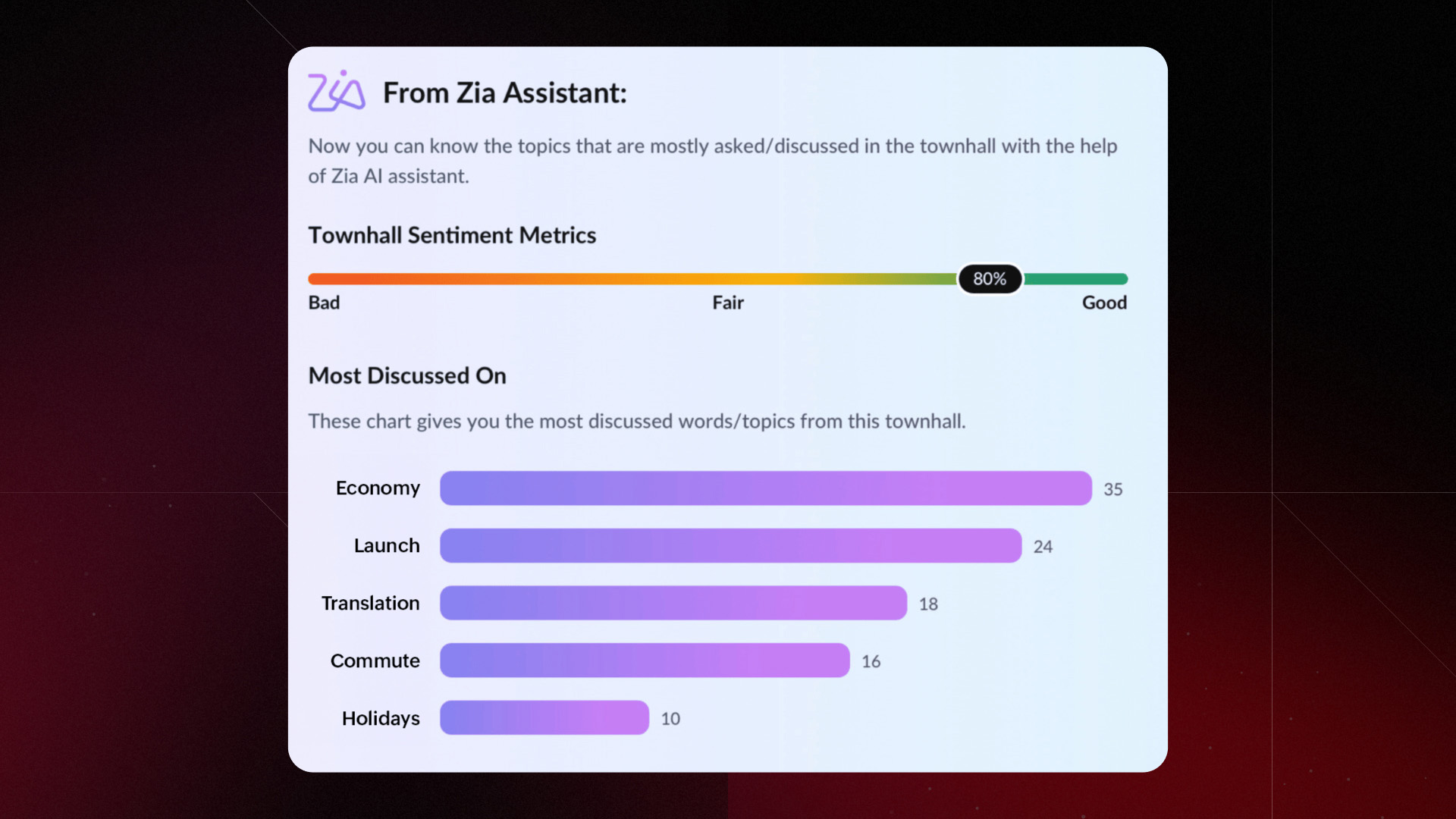 Zoho Connect automatically gauges the overall tone of the session. Was the mood generally optimistic, curious, or a bit anxious? Its analytics highlight the “Top trends.” If 40% of the questions are about “Remote Flexibility,” you know exactly what needs to be addressed in your next follow-up.