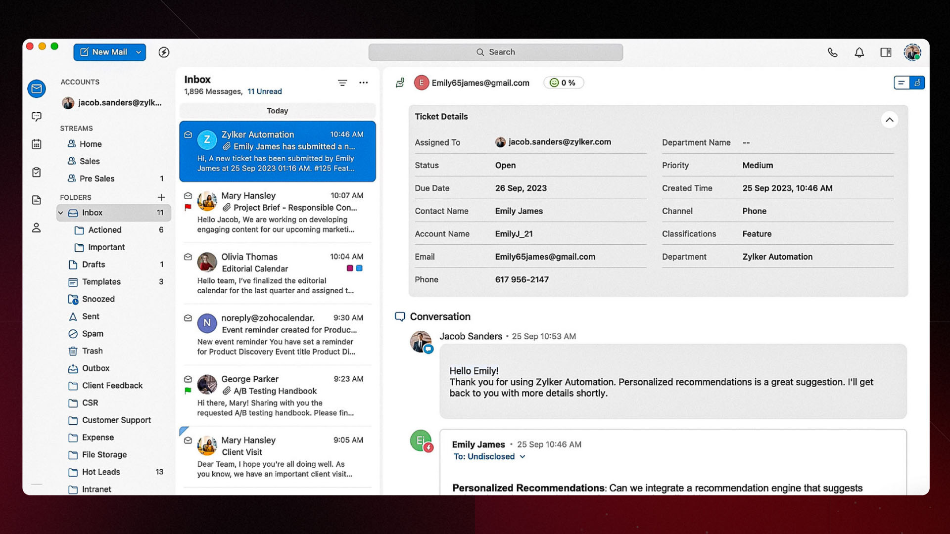 In Trident, when a ticket notification hits your inbox, you don’t just get a boring alert. Clicking the notification opens the full Zoho Desk ticket context right there, nested neatly inside your email view.