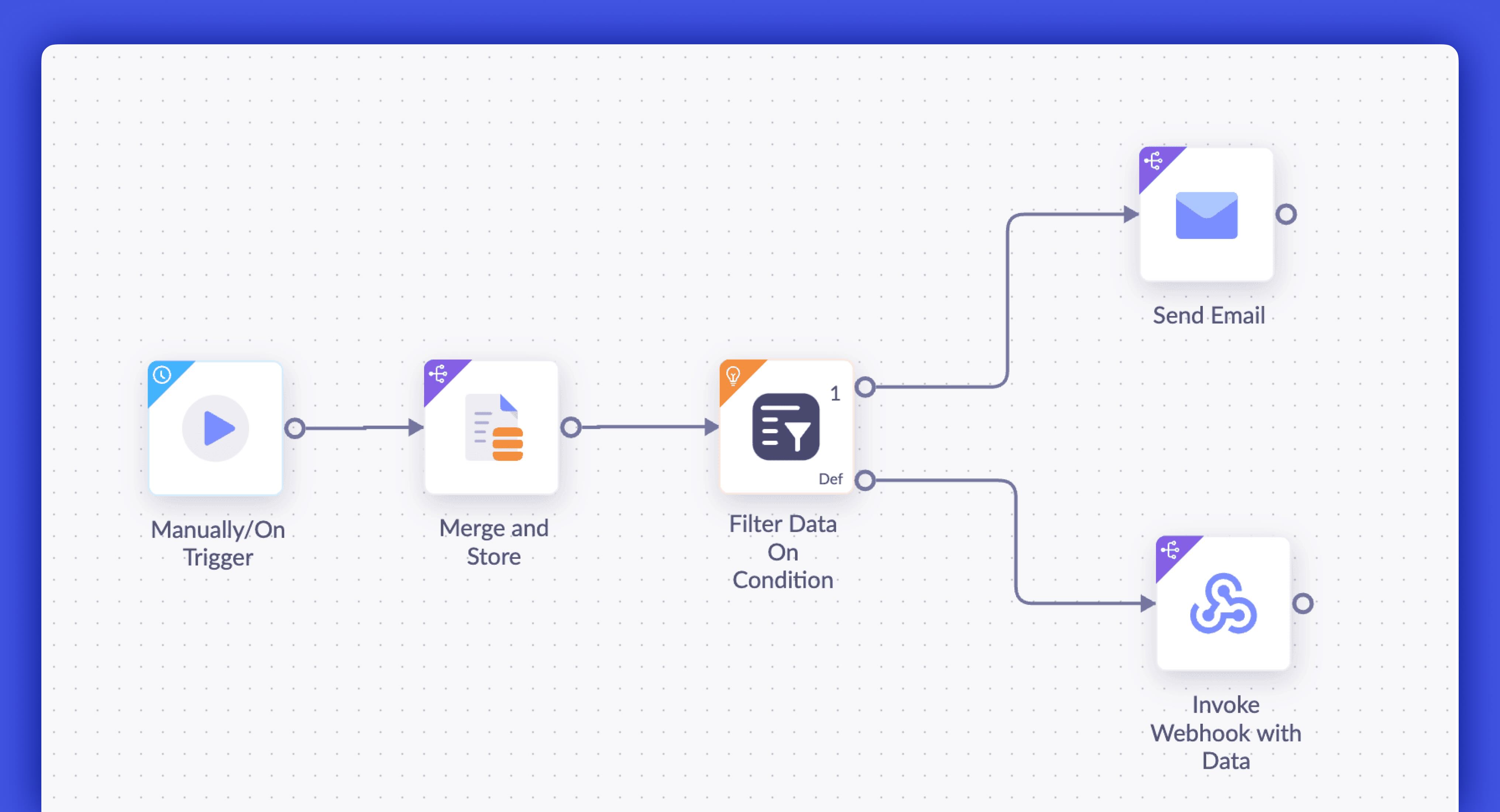 Simply drag and drop the desired cards onto the canvas, arrange them into clusters, and design end-to-end workflows seamlessly.