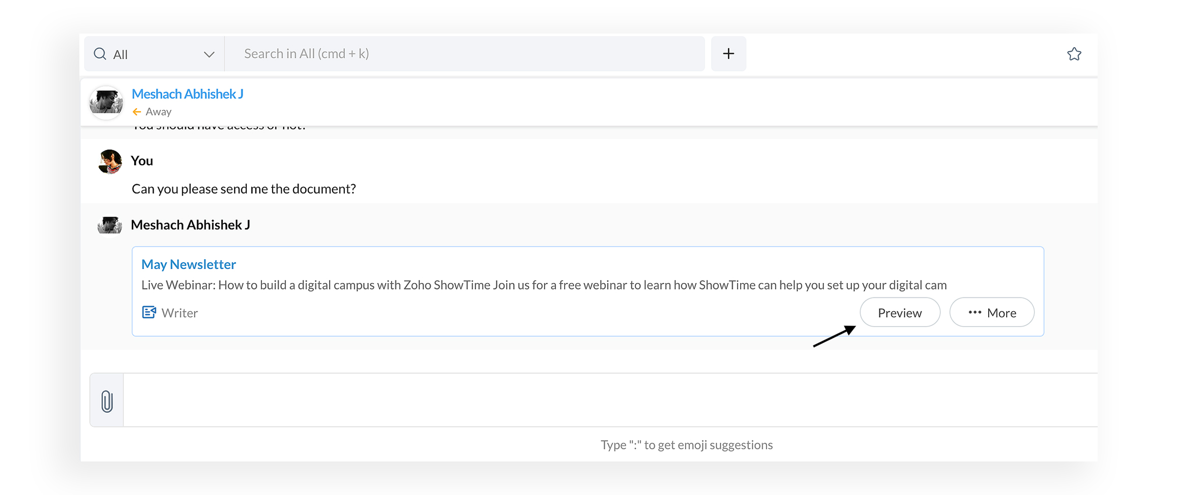 If your colleague wants you to take a quick look at a document, you can easily preview the shared document directly in Cliq, without wasting time opening the Writer app in another tab or window.