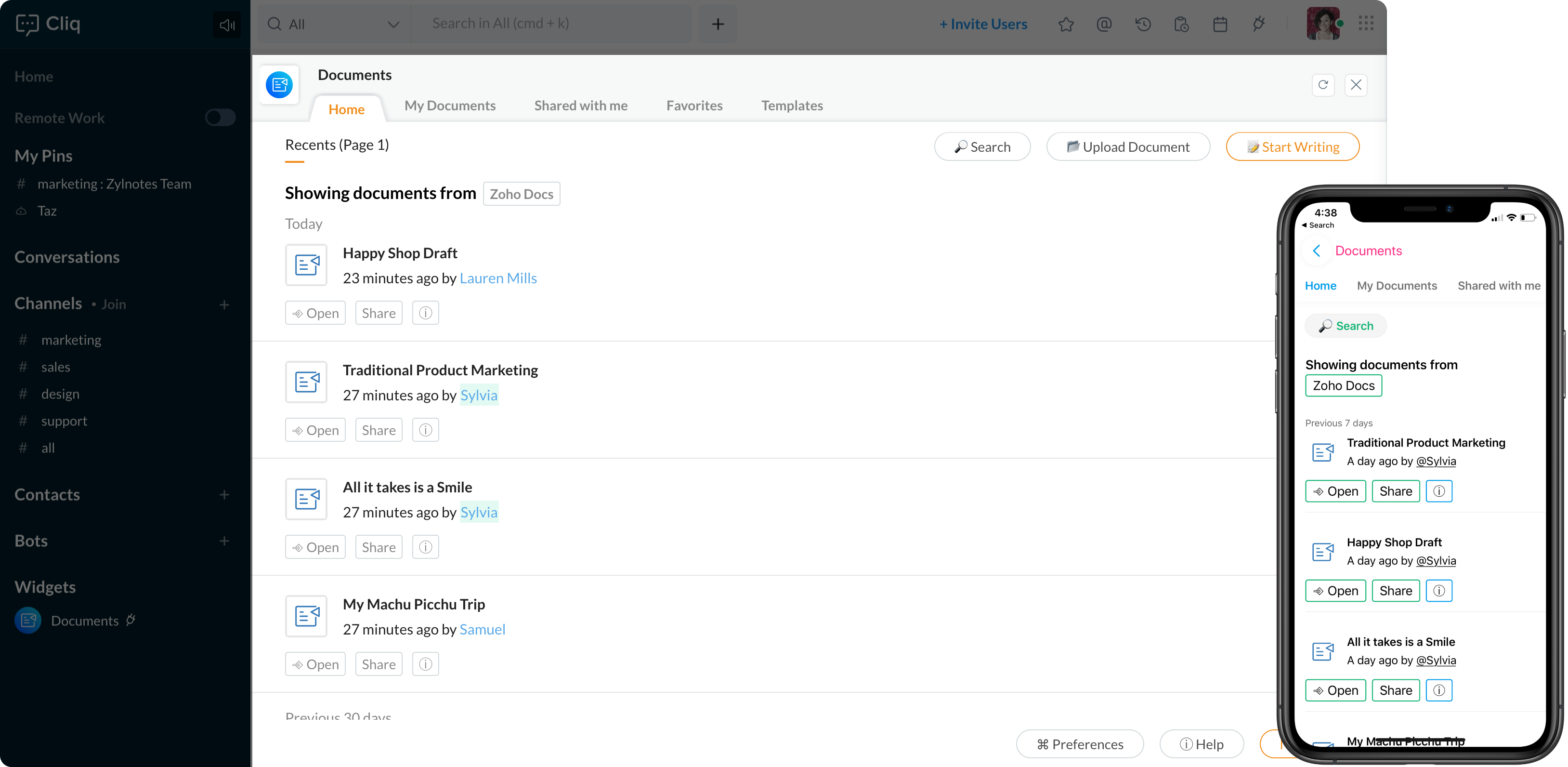 You can now view your recent and favorite documents, share documents with colleagues, and even view the ones shared with you—all while maintaining a seamless conversation on Cliq.