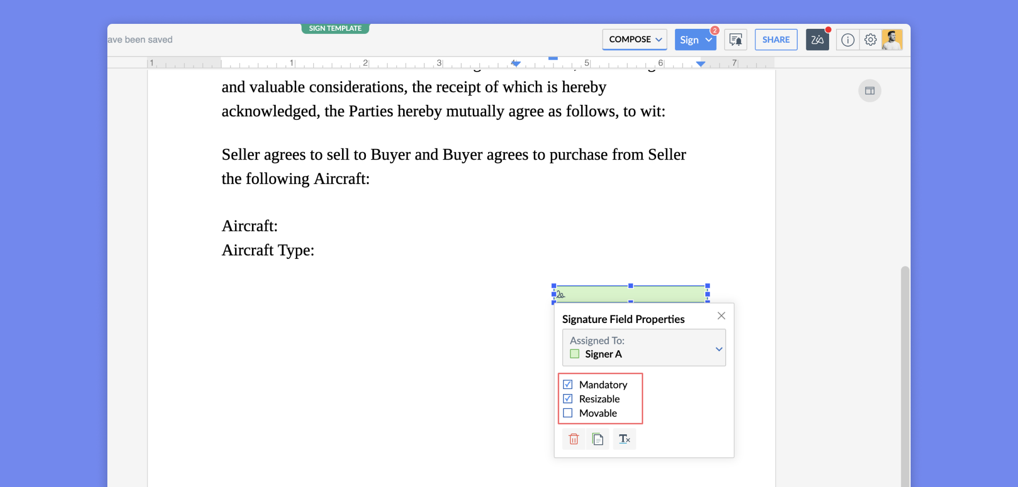Configure signer field properties, such as mandatory, movable, and re-sizable. Control the finest details of the signature blocks in your document.