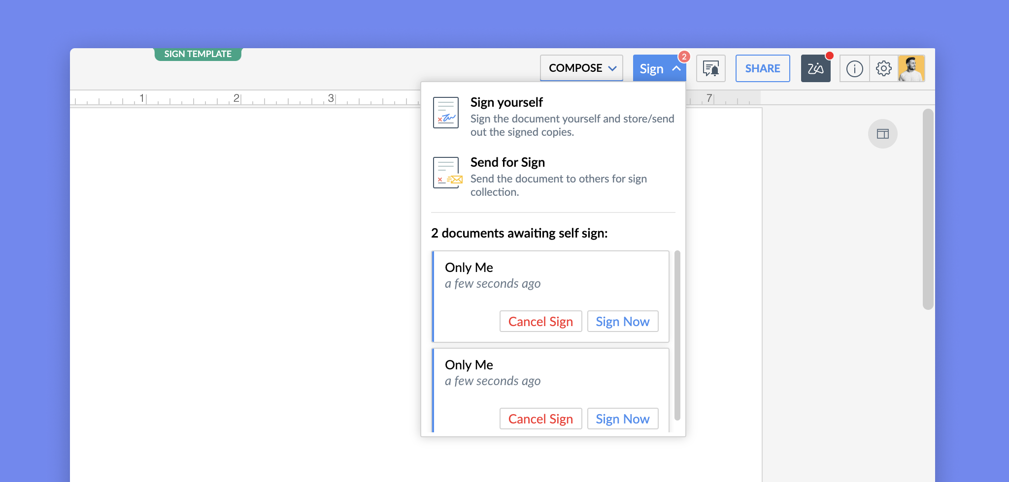 View a list of all documents in the Self-Sign Queue without moving away from the editor. You can even recall/cancel the signing process right from the queue.