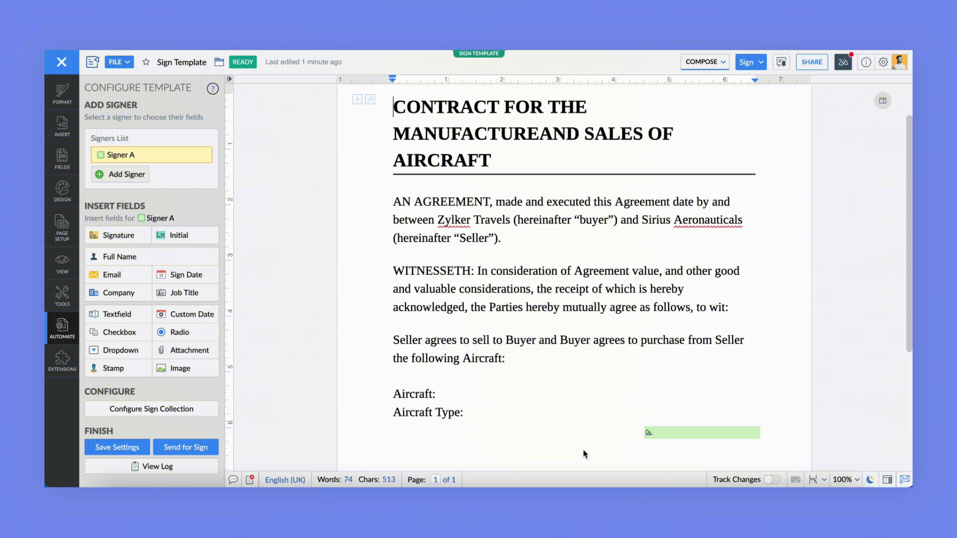 Let's say there are multiple signers in a document and you want the signature blocks to appear in a specific order. You can place the signer fields in the desired positions and make them non-movable to prevent them from being moved/re-orderded.
