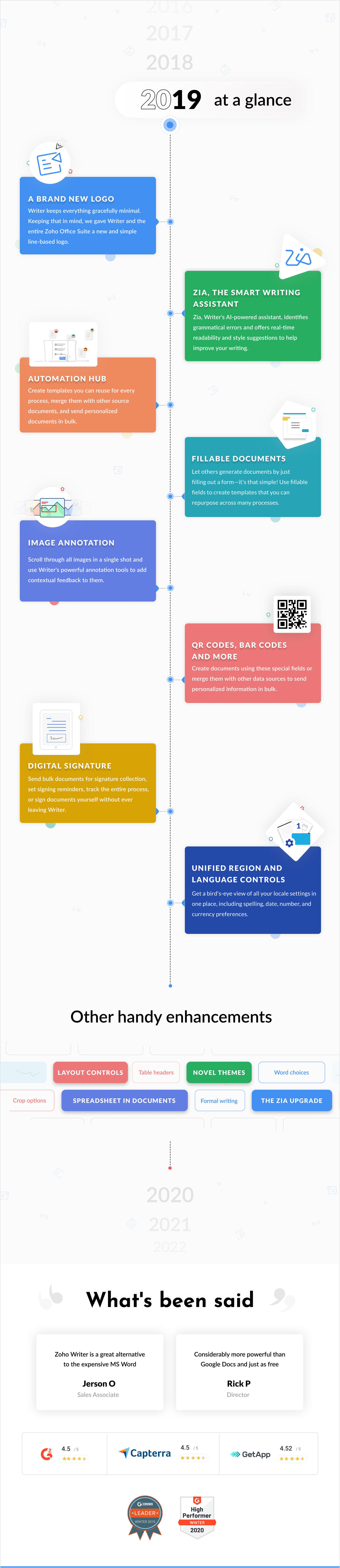 Make Zoho do more for you: You can now use Writer, along with Sheet and Show, as part of our cloud office suite and other collaboration tools by signing up for Zoho Workplace or Zoho One.