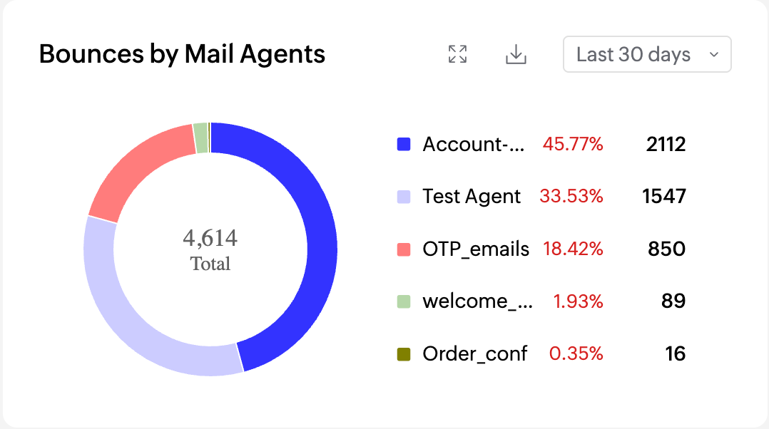 View a graph of the bounce count distribution across different domains or Mail Agents to find out which contributed most to the bounce rate. You can view the bounce percentage each has contributed over the chosen timeframe. This way, you can focus your corrective measures on the at-risk domains or Mail Agents.