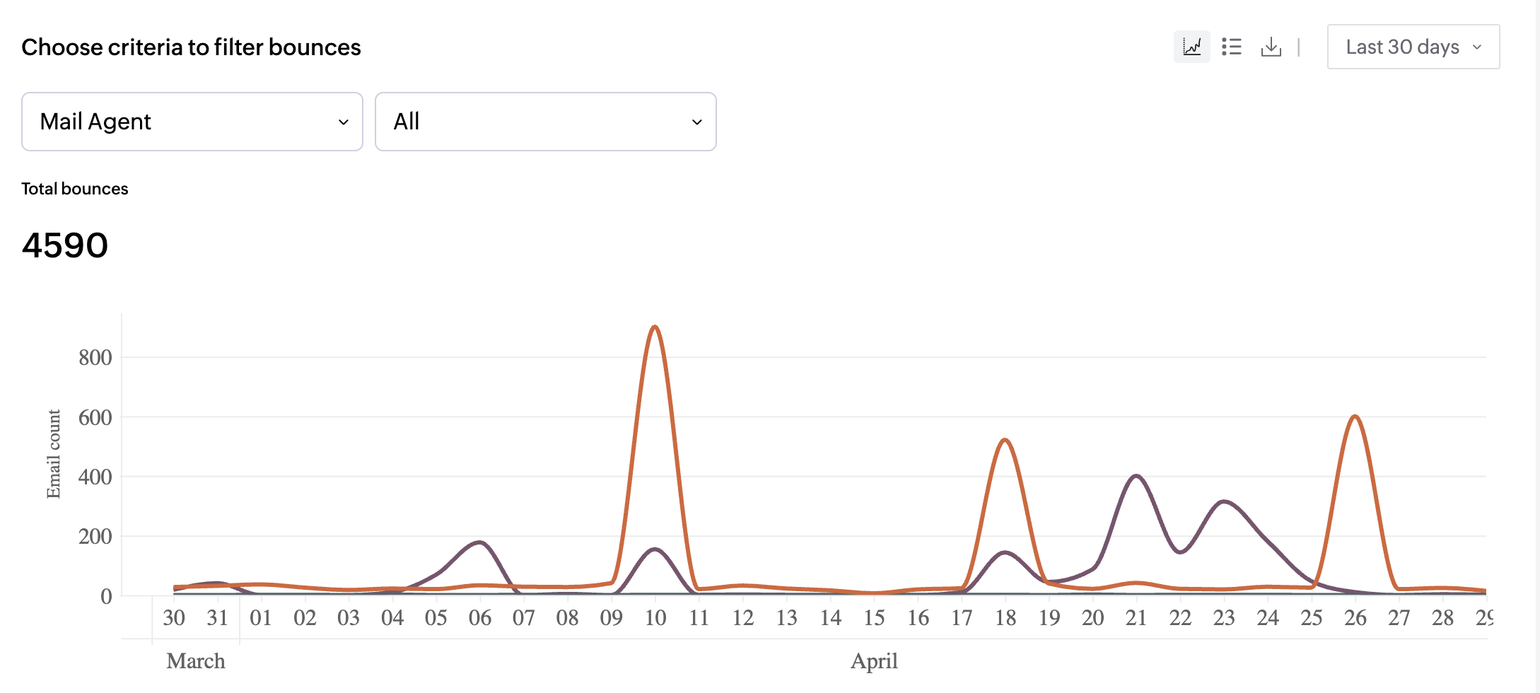 View the bounces that have occurred over a specific time as a graph or list, separated by cause. To make it easier, you can choose to see the overview for bounces belonging to specific Mail Agents or domains and download the chart for future reference.